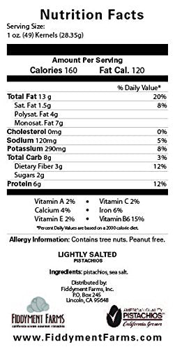 - Q: What are the main ingredients in Fiddyment Farms Lightly Salted Pistachios? A: The main ingredient in Fiddyment Farms Lightly Salted Pistachios is high-quality California-grown jumbo pistachios that are lightly salted and roasted in small batches to ensure freshness.