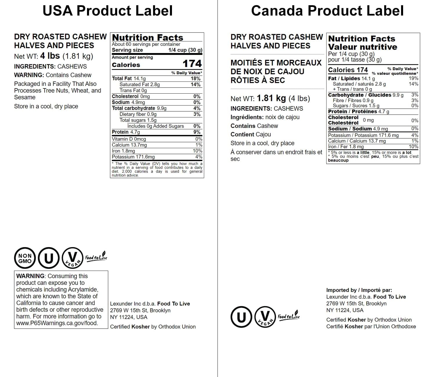 Food To Live - Dry Roasted Cashew Halves And Pieces, 4 Pounds - Unsalted Oven Roasted, No Oil Added, Keto, Kosher. High In Prote