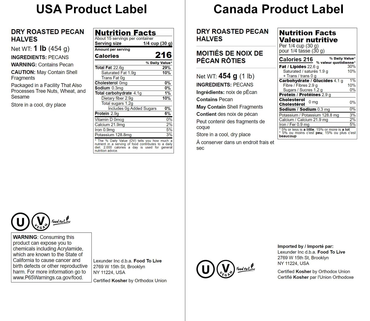 - Q: What makes Food to Live's Pecan Halves different from other nuts? A: Food to Live's Dry Roasted Pecan Halves are uniquely prepared with no oil added and are oven-roasted in small batches, ensuring a crunchy texture and rich nutty flavor. This premium quality and careful preparation set them apart from other nuts.