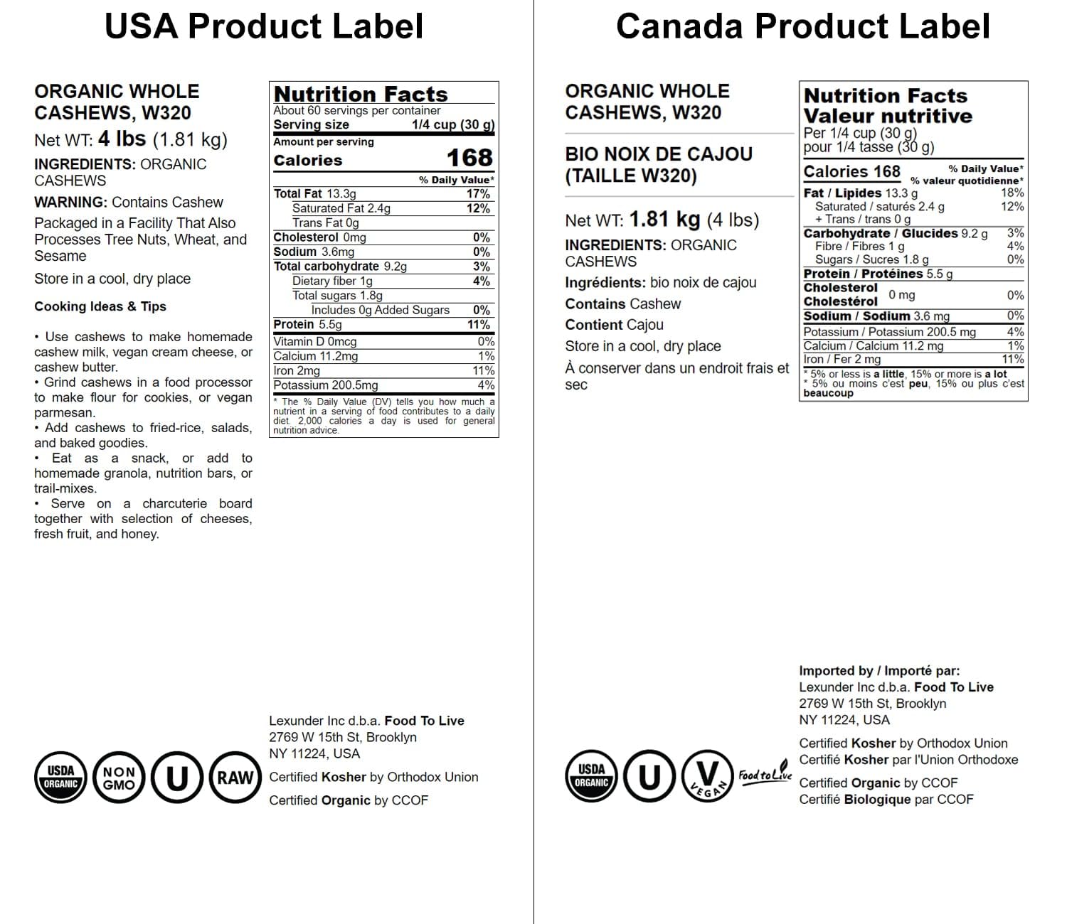 Delicious Organic Cashew nuts from Food to Live make a great snack. Nutritional Value Cashews are extremely nutritious nuts. They provide you with a mix of essential minerals and vitamins. They are exceptionally rich in B vitamins, copper, iron. Directions Food to Live resealable bag will help you keep the nuts fresh if you close it securely and store them in a cool, dark place. You can store them in the fridge for up to 9 months. . Due to their rich sweet flavor, cashews are often added to sauces, desserts, and confections. They also go well when sprinkled over salads made from either vegetables or fruits. This product is processed in a facility that also processes wheat.