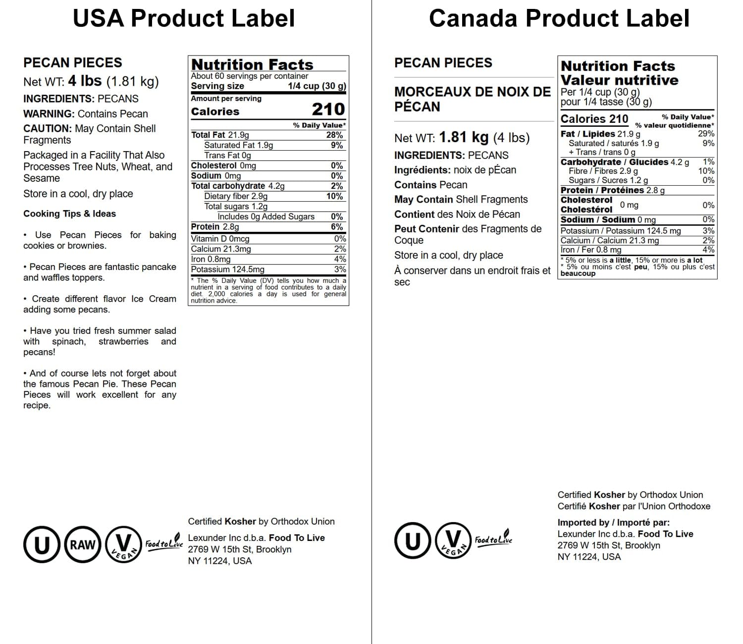 Q: What is the size and weight of the Food to Live Pecan Pieces package?A: The Food to Live Pecan Pieces come in a 64-ounce (4-pound) package, making it a bulk option ideal for cooking, baking, or snacking.