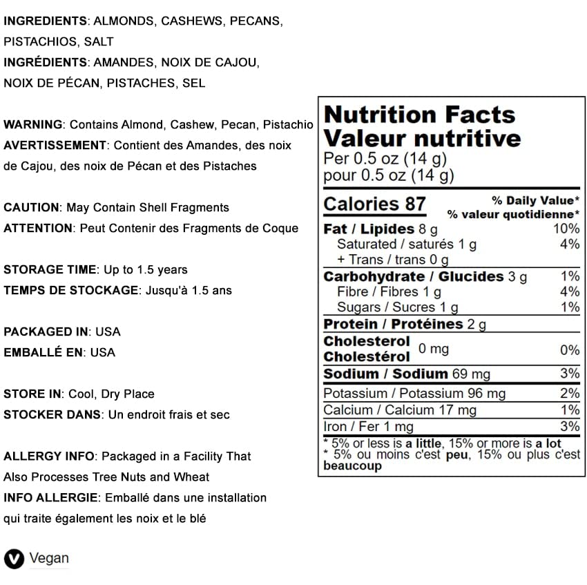 We Are Happy To Present Our Four Nuts Mix Which Takes An Honorable Place In Food To Live Signature Snacks Collection. It Includes 4 Nutrient-Dense Nut Varieties That Are In Fact Our Best-Sellers: Almonds, Cashews, Pecans, And Pistachios. This Mix Is Gently Roasted In The Oven Without Using Oil, And Is Lightly Seasoned With Himalayan Pink Salt, Which Has A Lower Sodium Content Than Table Salt And Is Higher In Minerals. Roasted And Salted Four Nuts Mix Uses Mixed Nuts Lightly Salted Have An Incredible Intense Flavor. The Crispiness Of Pistachios And Pecans Is Complimented By The Creamy Flavor Of Cashews And Sweet Notes Of Almonds. Mixed Nuts Individual Packs Are Perfect For Snacking On The Go. Grab Them On A Hike, Plane, Road Trip, School, And To Work. Apart From That, Mixed Nuts Can Be Crashed And Sprinkled Over Ice Cream, Desserts, Smoothies, Toasts, Eggs, Salads, And Pasta. Furthermore, Try Adding Mixed Nuts Salted To Your Baked Goodies, For Example Pies, Cakes, Breads, Cookies, And Muffins - Not Only Will They Add An Exquisite Flavor, But They Will Also Boost It With Nutrition. Four Nuts Mix Nutritional Profile Four Nut Mix By Food To Live Consists Of Highly Nutritious Nuts That Will Significantly Enrich Your Diet. Almonds Are An Amazing Source Of Vitamin E, Cashews Are Loaded With Potent Antioxidants (Namely Polyphenols), Pistachios Are A Powerhouse Of Vitamin B6, And Pecans Contain Good Amounts Of Calcium, Magnesium, And Potassium. Besides, They Are Low In Carbs Which Makes Them Suitable For Keto And Paleo Diets. Whats Great Is That Roasted Mixed Nuts Have Almost The Same Nutritional Profile As Raw Ones, So You Wont Lose On Nutrients When Eating Them. Storage Tips Store Mix Nuts In A Tightly Closed Container And In A Cool Dry Area. If You Want To Purchase Mixed Nuts Bulk Bags For Long-Term Usage, Its Better To Keep Them In A Fridge Or A Freezer.
