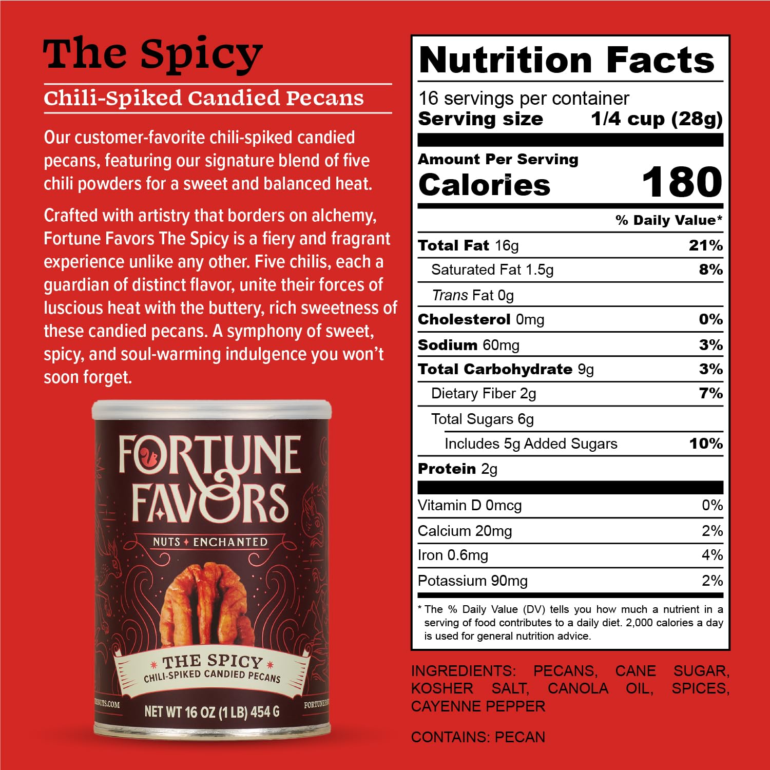 - Q: What makes Fortune Favors Candied Pecans healthier than traditional options? A: Fortune Favors Candied Pecans contain only 7% sugar compared to traditional candied pecans, which can be up to 50% sugar by weight. This allows the natural flavor of the pecans to shine through while being lower in trans-fats and high in protein, fiber, vitamins, minerals, and antioxidants.