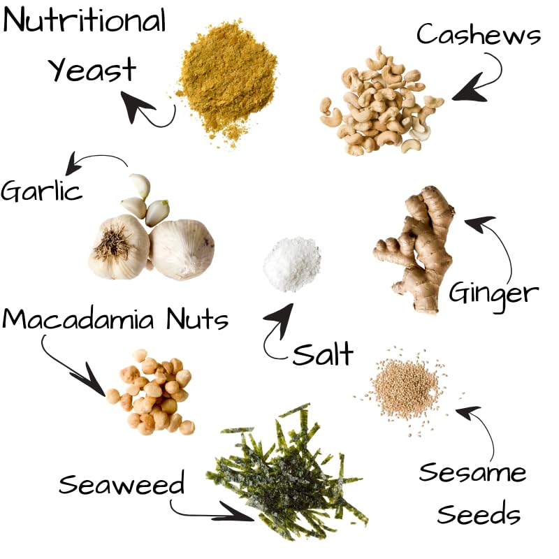Made With Raw Cashew, Nutritional Yeast, Macadamia Nuts, Sesame Seed, Seaweed, And Spices