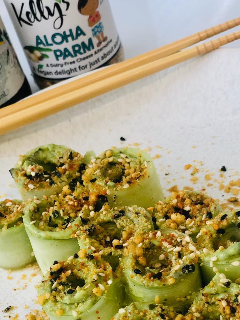 Q: What is Kelly's Gourmet Aloha Parmesan made from?A: Kelly's Gourmet Aloha Parmesan is made from raw cashews, nutritional yeast, macadamia nuts, sesame seeds, seaweed, and various spices, providing a unique and flavorful dairy-free cheese alternative.