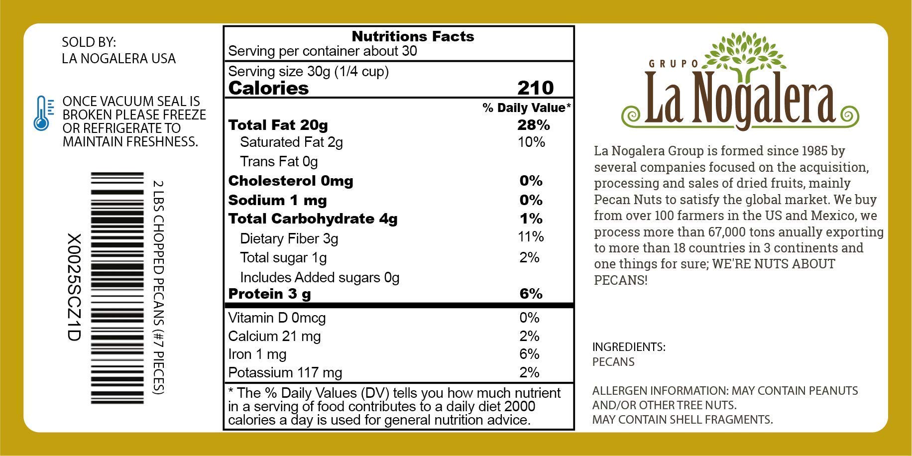 Q: What are the health benefits of consuming La Nogalera chopped shelled pecans?A: La Nogalera chopped shelled pecans are a great source of healthy fats, protein, and essential vitamins and minerals. They are rich in antioxidants and may support heart health, weight management, and brain function.
