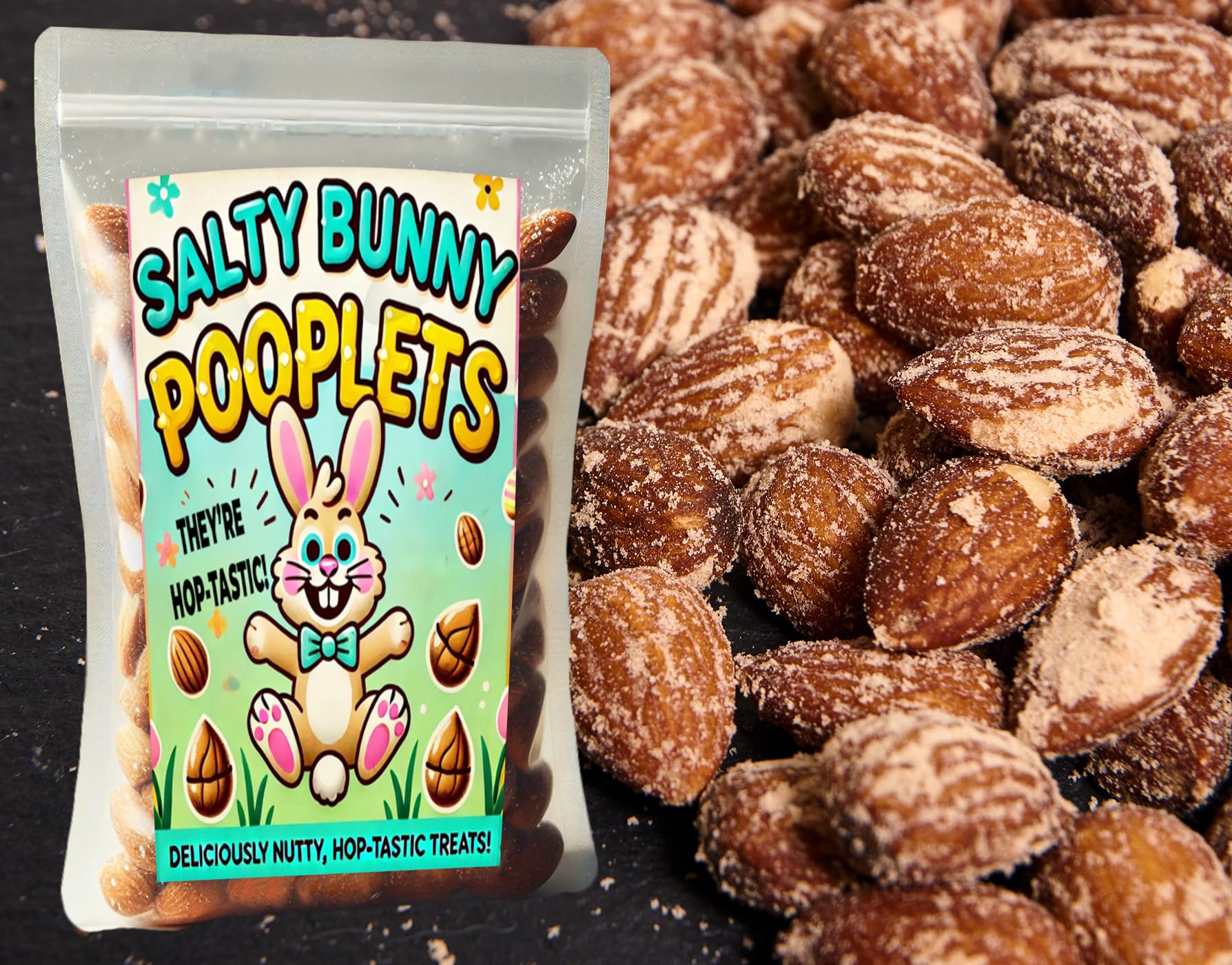 Q: What are Salty Bunny Pooplets made of?A: Salty Bunny Pooplets are made from premium roasted almonds that are lightly salted, creating a deliciously crunchy snack that is both savory and satisfying.