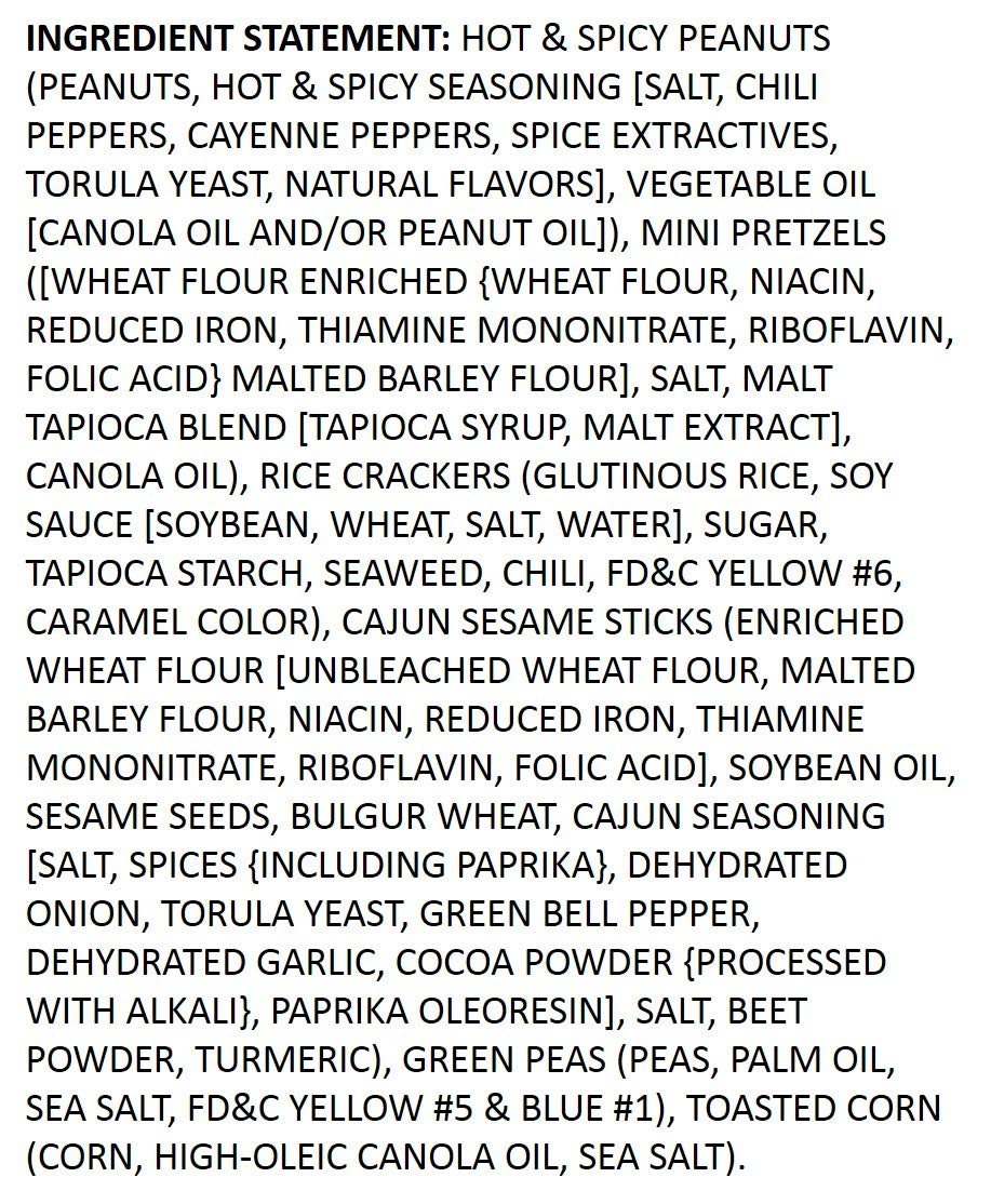 Q: What ingredients are included in Snak Club Spicy Party Snack Mix?A: Snak Club Spicy Party Snack Mix features a delicious blend of spicy rice crackers, hot and spicy peanuts, Cajun sesame sticks, pretzels, toasted corn, and dried green peas, providing a savory and crunchy experience.