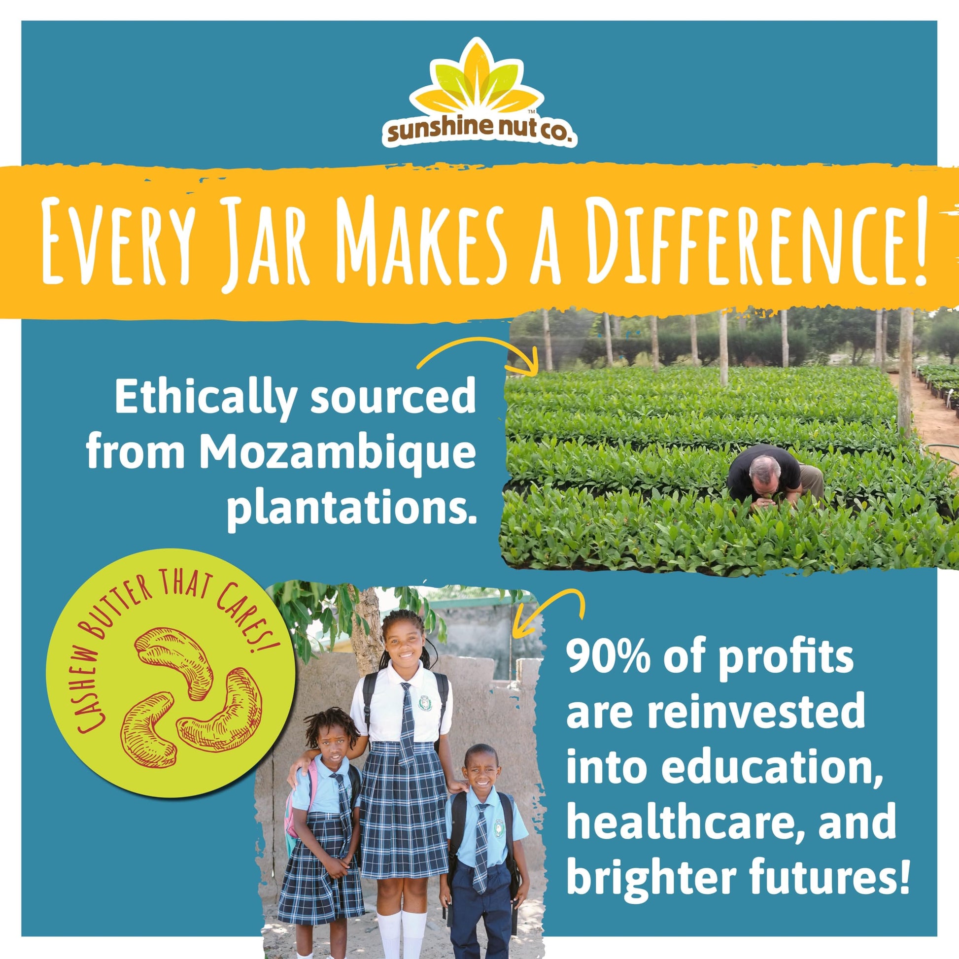 - Q: Where are the cashews sourced from? A: The cashews in the Sunshine Nut Co. Cashew Butter Trio are ethically sourced from Mozambique. By choosing this product, you are supporting local farmers and contributing to community development projects, as 90% of the profits are reinvested into social programs.