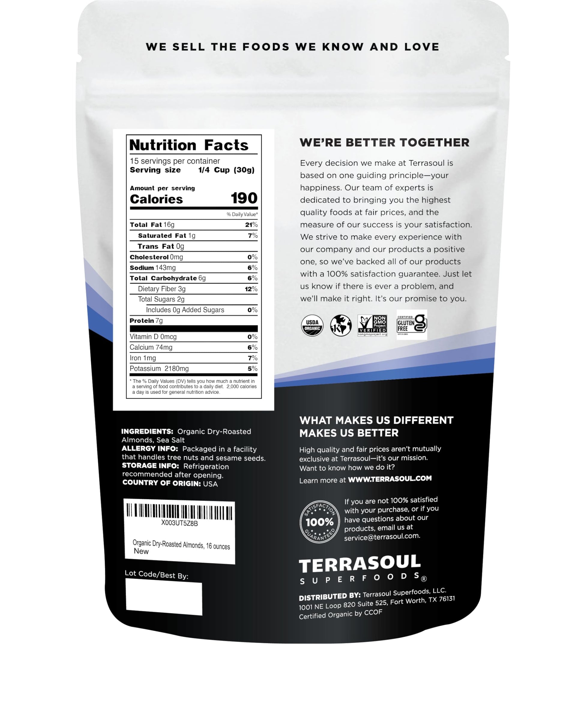 - Q: How should I store the almonds to maintain freshness? A: To maintain the freshness of Terrasoul Organic Dry-Roasted & Lightly Salted Almonds, keep them in a cool, dry place. The resealable pouch is designed to help preserve the almonds' crispiness, ensuring each bite remains fresh and flavorful.