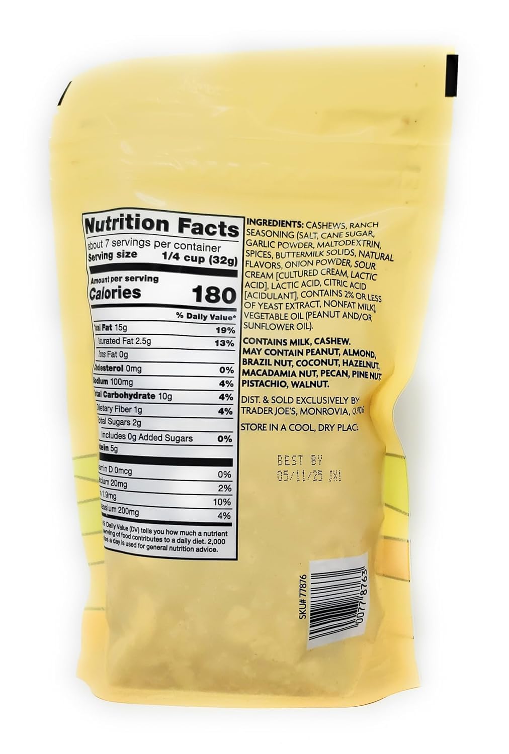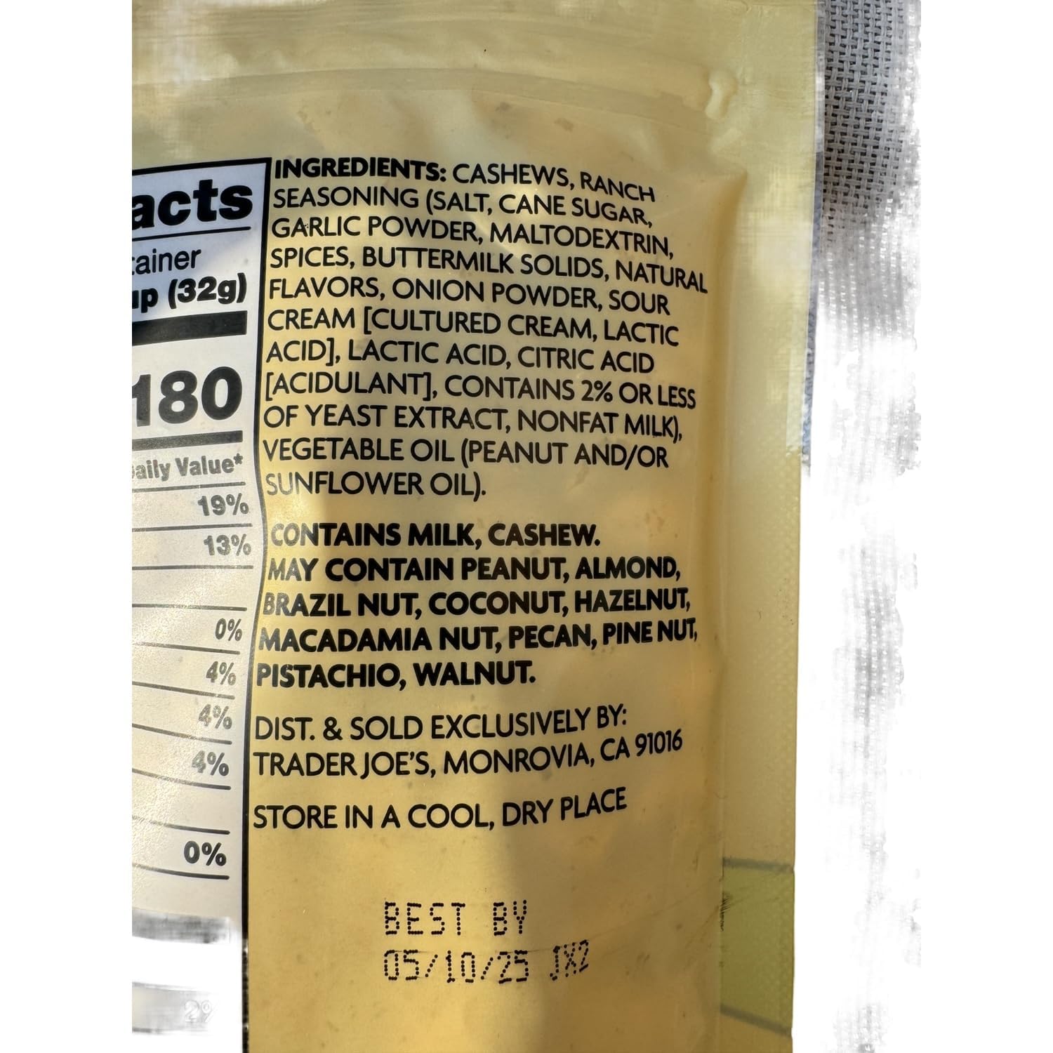 Q: How many servings are in the pack of Trader Joe's Ranch Seasoned Cashews?A: Each pack of Trader Joe's Ranch Seasoned Cashews typically contains multiple servings, making it a great option for sharing or enjoying on your own.