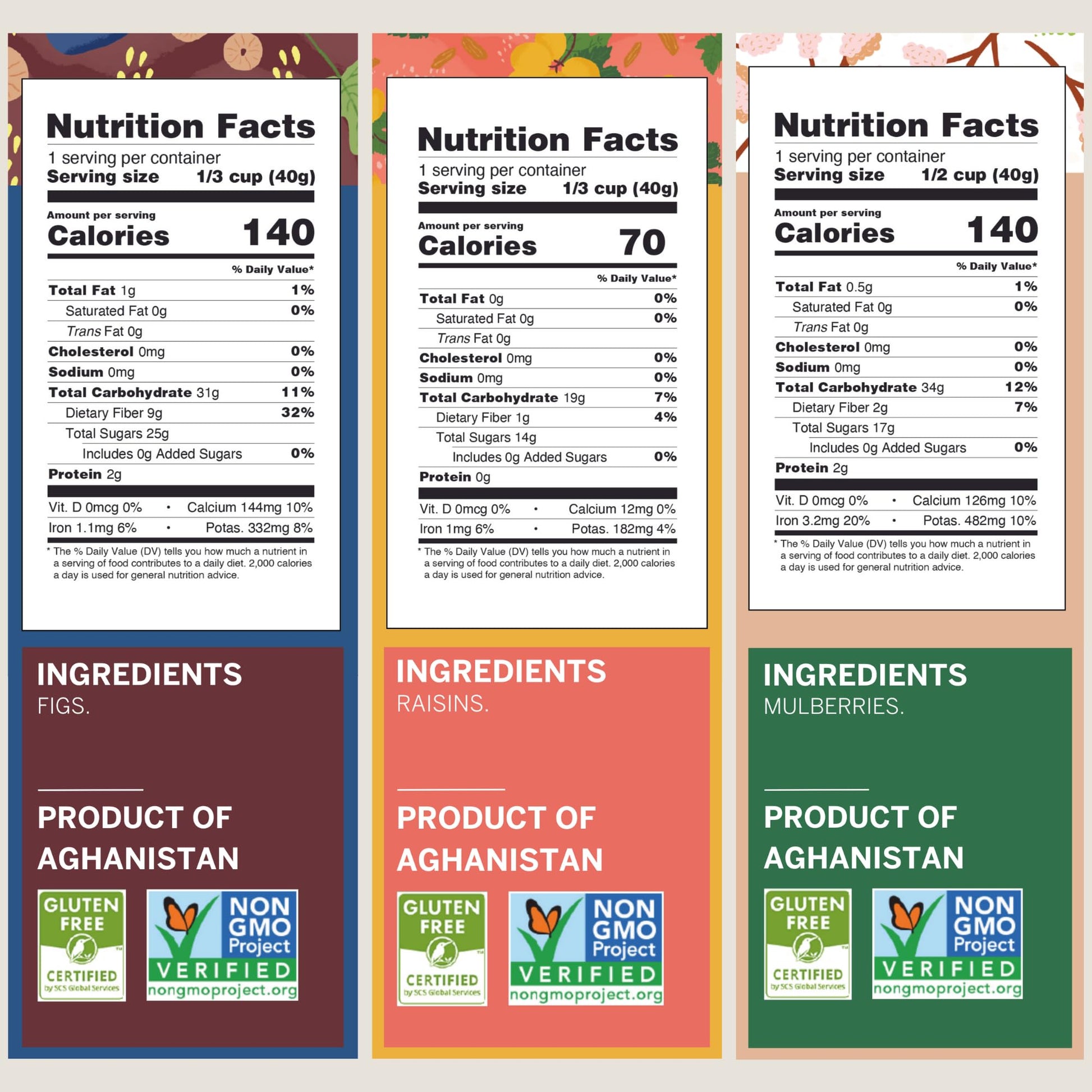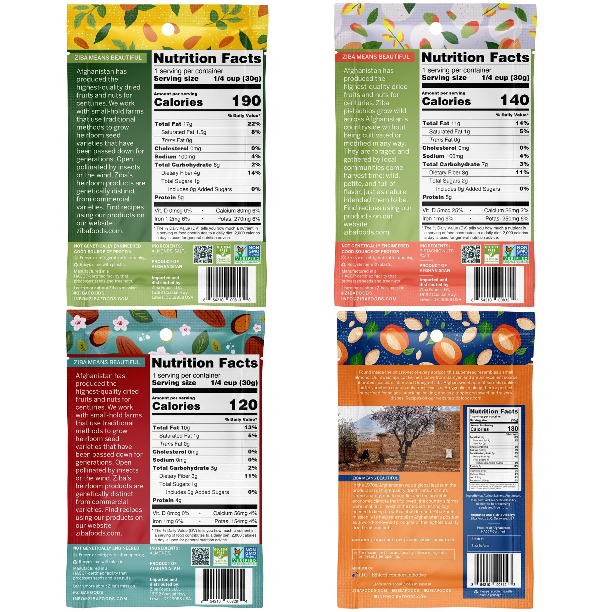 Q: What are the main ingredients in the Ziba Variety Fruit & Nut Bundle?A: The Ziba Variety Fruit & Nut Bundle includes heirloom almonds, salted pistachios, sweet apricot kernels, sun-dried figs, dried white mulberries, and kishmish raisins, all sourced from family farms in Afghanistan.