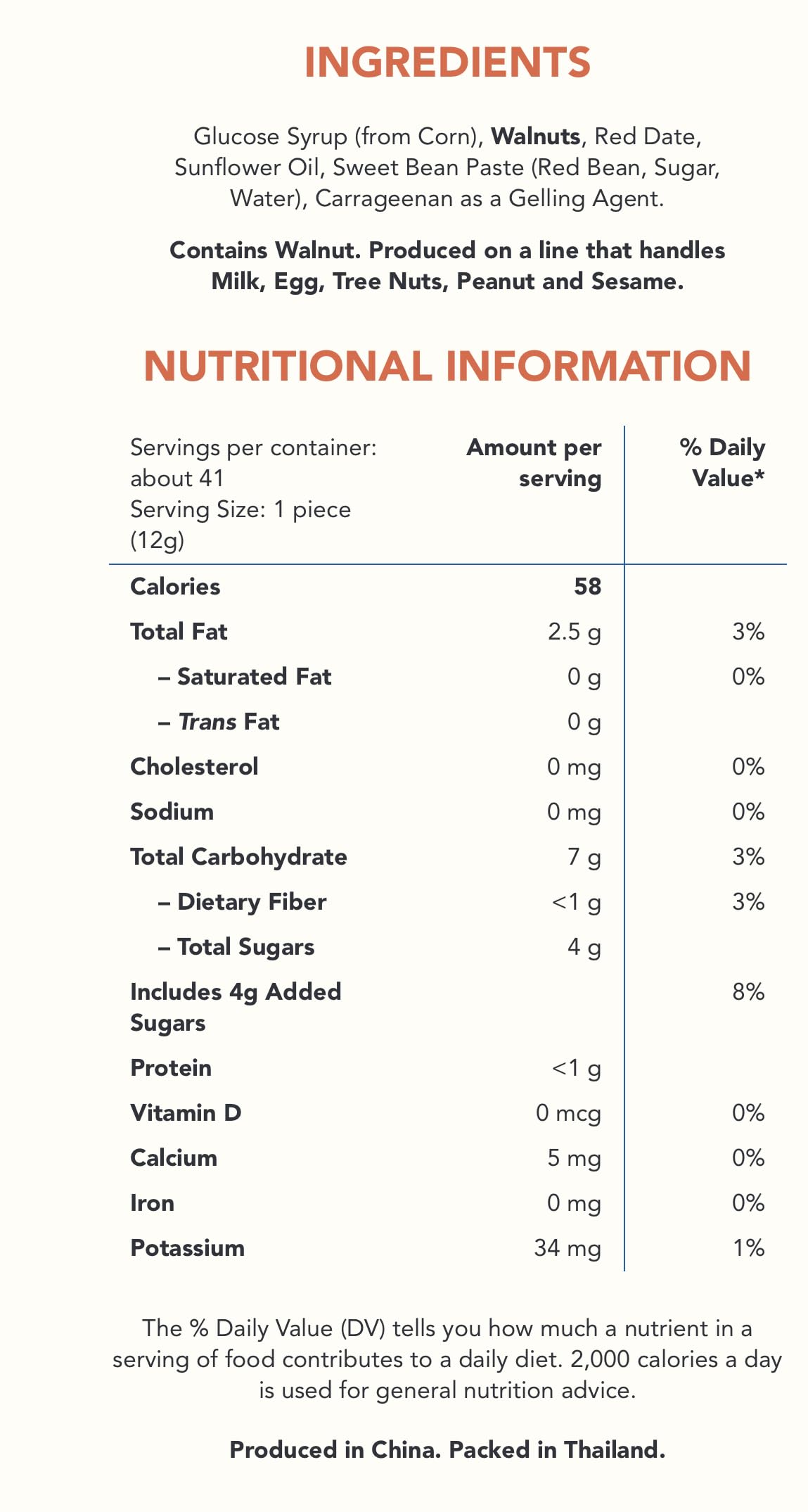 Ingredients Glucose Syrup (From Corn), Walnuts, Red Date, Sunflower Oil, Sweet Bean Paste (Red Bean, Sugar, Water), Carrageenan As A Gelling Agent. Contains Walnut. Produced On A Line That Handles Milk, Egg, Tree Nuts, Peanut And Sesame.