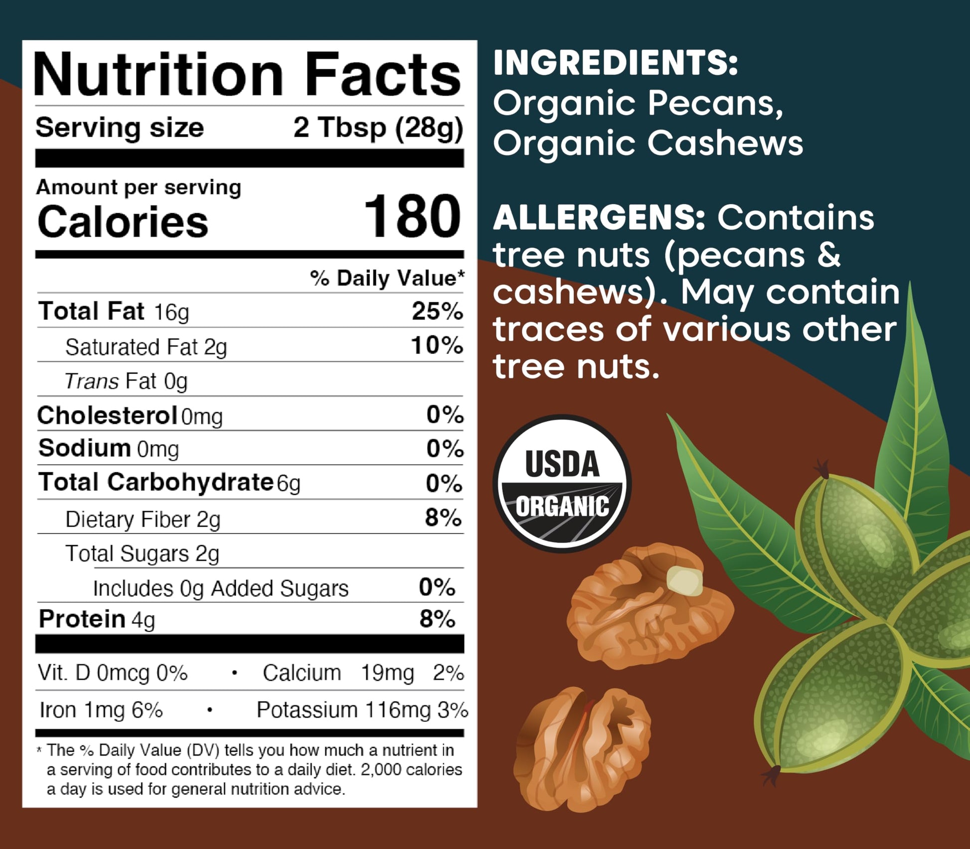 Q: What are the main ingredients in Wilderness Poets Pecan Butter?A: Wilderness Poets Pecan Butter is made from organic raw pecans and organic raw cashews, ensuring a delicious and nutritious nut butter.