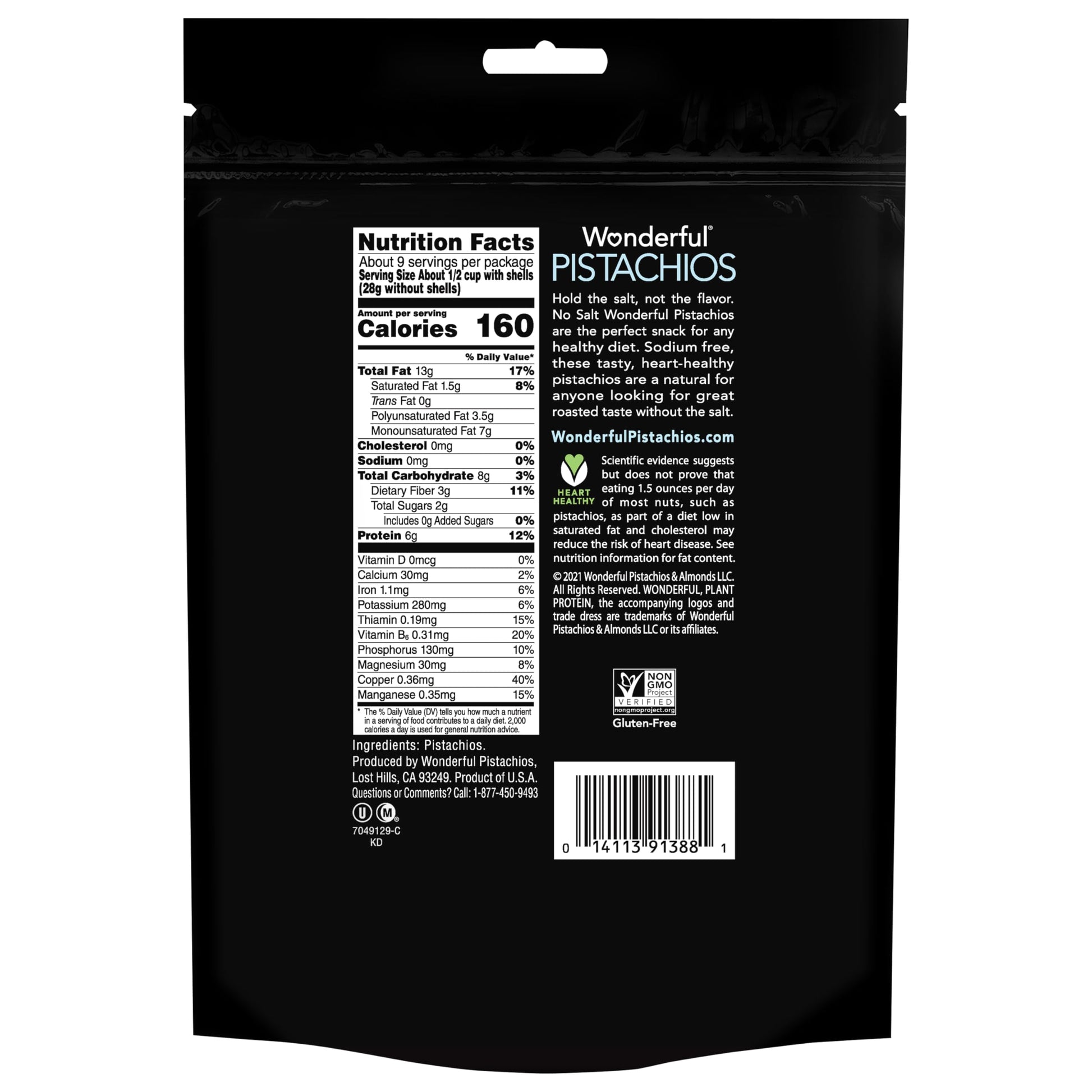 One 16 Ounce Bag Of No Salt, In-Shell Wonderful Pistachios Wonderful Pistachios Are A Smart, Healthy Choice For Folks Around The World. Wonderful Pistachios Grows All Of Its Pistachios In Californias Fertile San Joaquin Valley. The Warm Days And Cool Nights Work In Harmony With The Regions Natural Soils To Create The Perfect Growing Climate. We Then Carefully Tend And Harvest Each Pistachio Using The Latest In Sustainable Practices. Nutritious And Healthy Pistachios Are Great As Part Of An Overall Healthy Diet. Pistachios Are Also A Good Source Of Plant-Based Protein. And In Addition To Tasting Great, A Single Serving Includes About 49 Pistachios, Enough To Satisfy Your Snacking Needs. Note: Contains Tree Nuts (Pistachios)