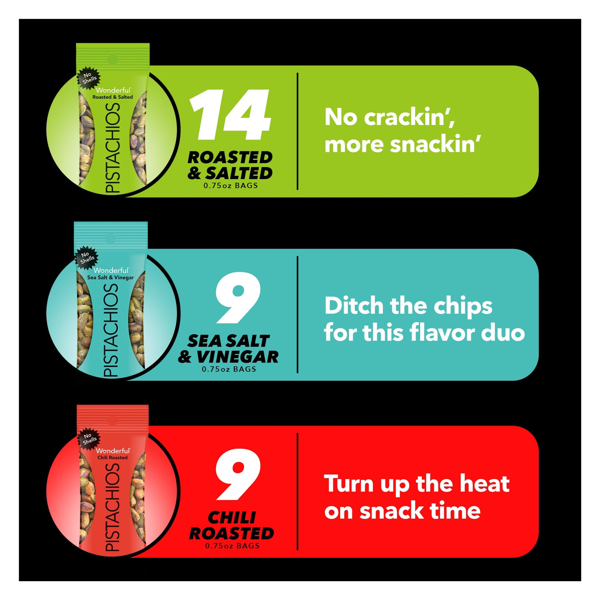 Q: What flavors are included in the Wonderful Pistachios No Shells Variety Pack?A: The Wonderful Pistachios No Shells Variety Pack includes three delicious flavors: 14 bags of Roasted and Salted, 9 bags of Chili Roasted, and 9 bags of Sea Salt & Vinegar.