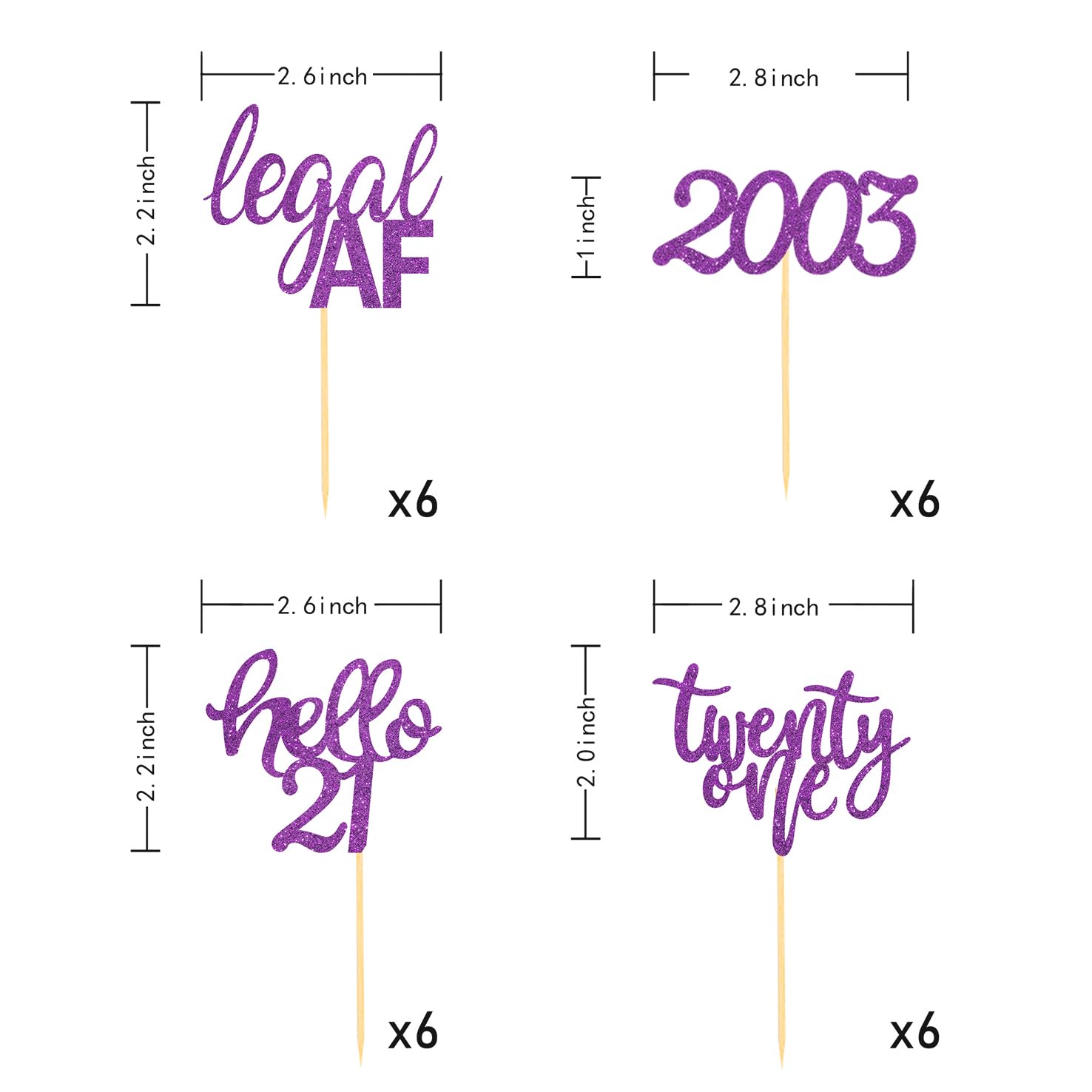 Q: What material are the 24 Pcs Glitter 21st Birthday Cupcake Toppers made of?A: The cupcake toppers are made of high-quality glittery cardstock combined with food-grade wooden sticks, ensuring both safety and durability.