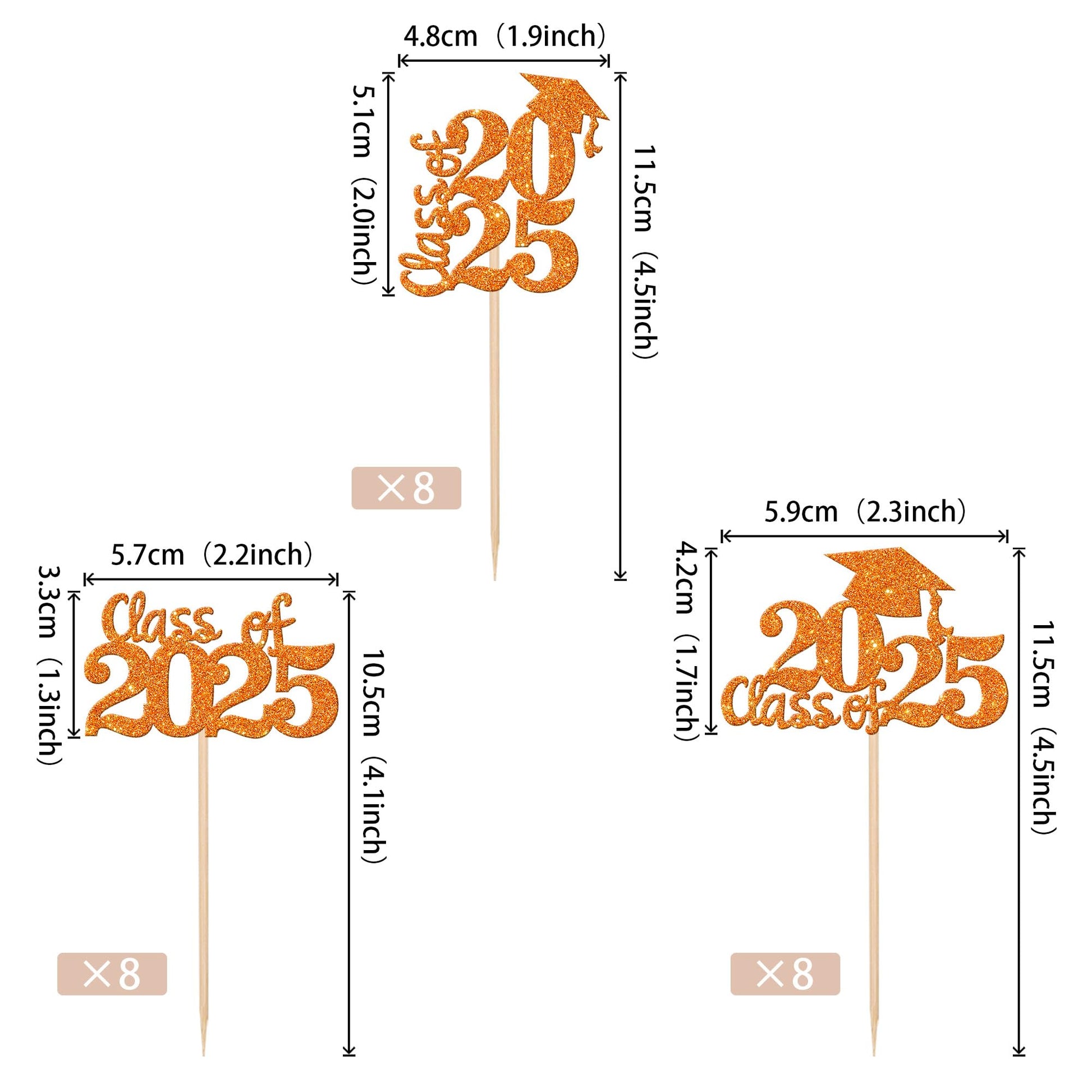 Q: What are the dimensions of the graduation cupcake toppers?A: The graduation cupcake toppers come in three sizes: 1.9 x 4.5 inches, 2.2 x 4.1 inches, and 2.3 x 4.5 inches, including the stick.