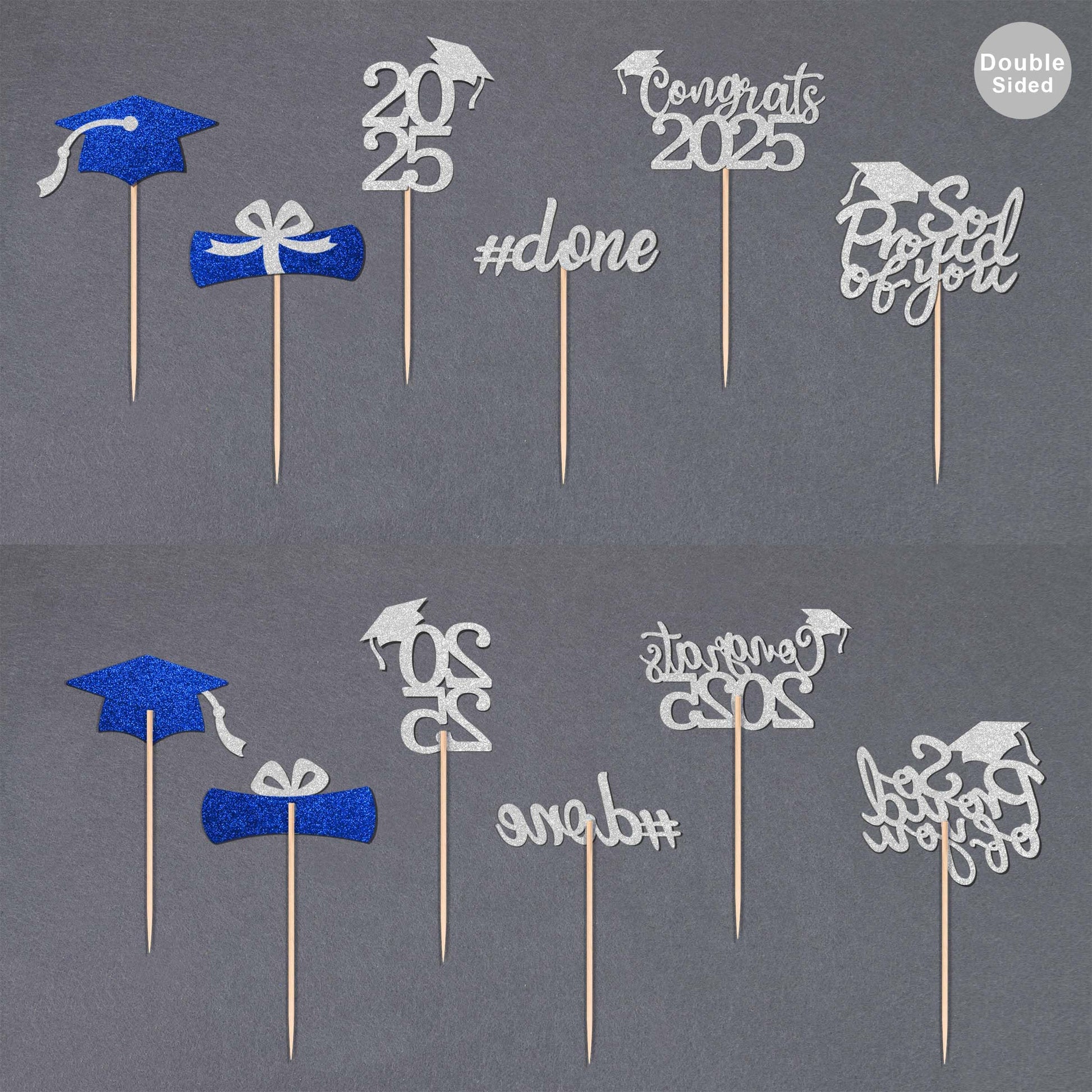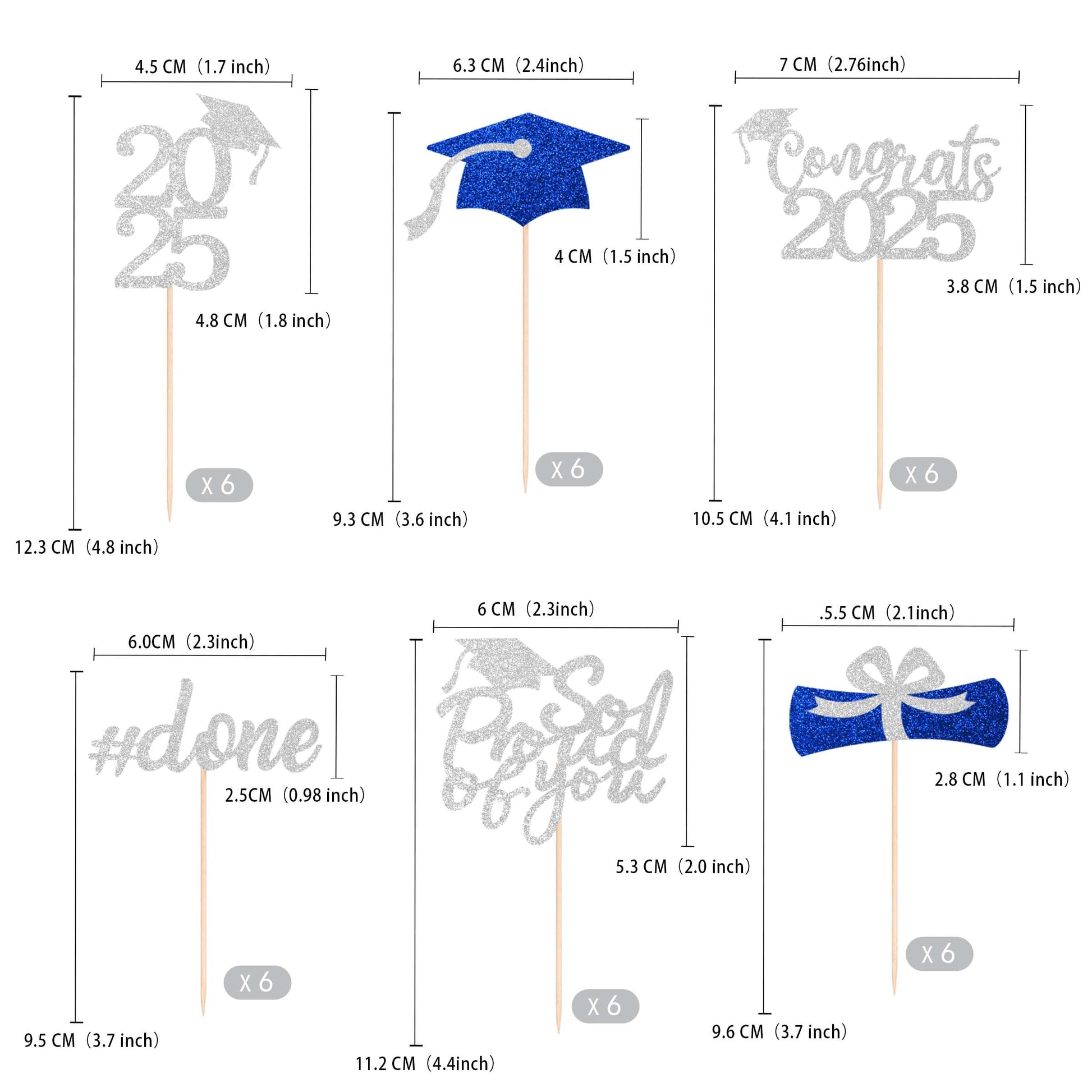 Q: What are the dimensions of the Class of 2025 cupcake toppers?A: The cupcake toppers come in various sizes: the '2025' topper measures 1.8 x 1.9 inches, the diploma topper is 2.2 x 1.1 inches, the cap topper is 2.5 x 1.6 inches, the 'Congrats 2025' topper is 2.8 x 1.5 inches, the '#done' topper is 2.4 x 0.98 inches, and the 'So proud of you' topper is 2.4 x 2.1 inches.