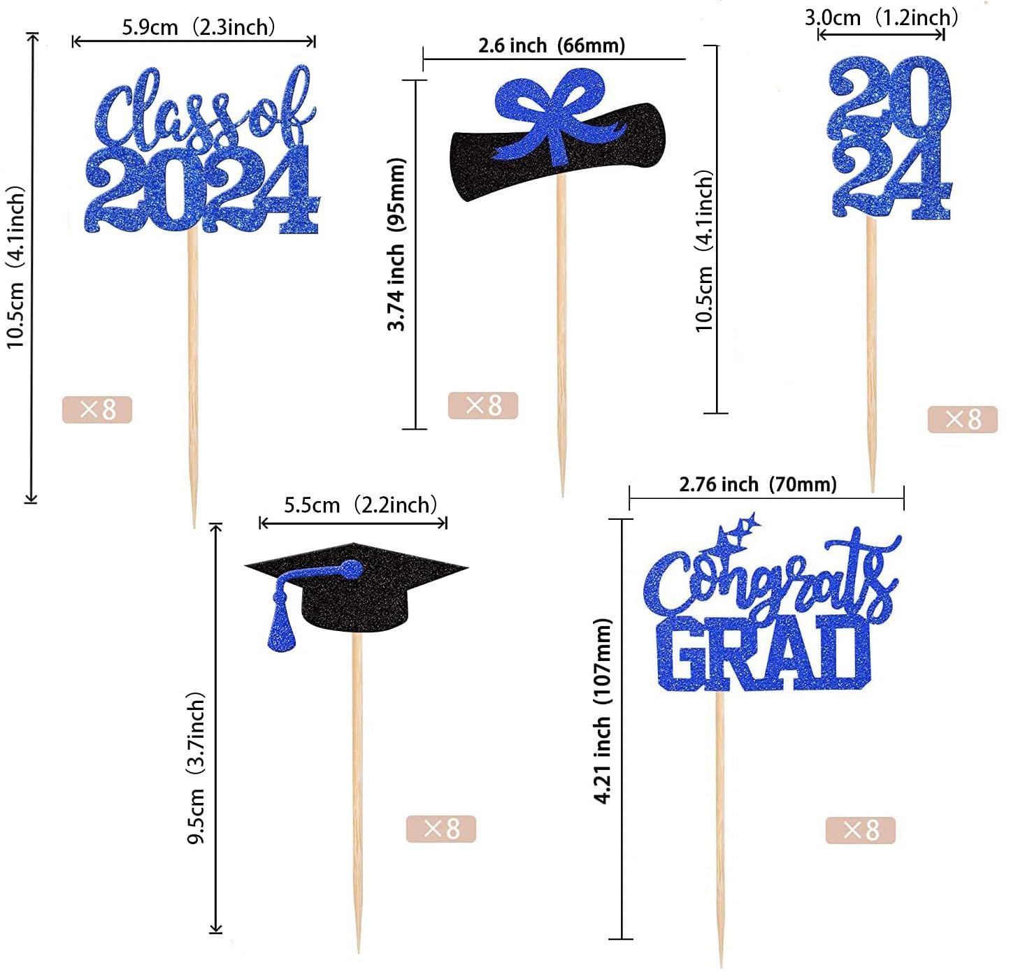 Q: What designs are included in the 2024 graduation cupcake decoration set?A: The set includes 40 selected pieces featuring five unique designs: congrats graduates, diplomas, 2024 selections, graduation hats, and 2024 graduates.