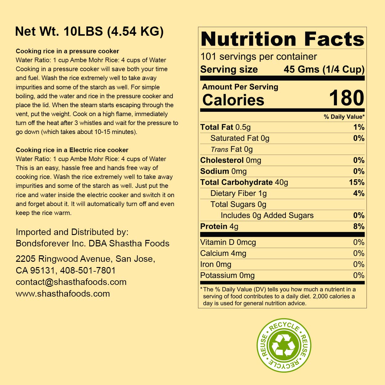 - Q: How should I cook Ambe Mohr rice for the best results? A: For optimal results, rinse Ambe Mohr rice under cold water before cooking to remove excess starch. Use a 1:1.5 rice-to-water ratio and bring to a boil, then reduce to a simmer for about 10-15 minutes until the rice is tender and the water is absorbed.