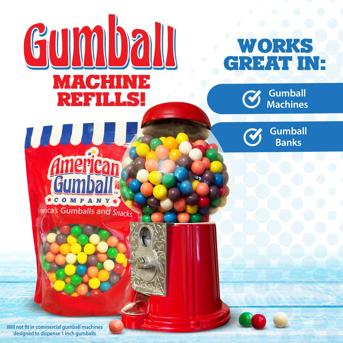 - Q: What size gumballs are included in the American Gumball Company's refill bag? A: The American Gumball Company's refill bag contains gumballs sized at .62 inches, which are perfect for any gumball machine designed for 1/2 inch gumballs.