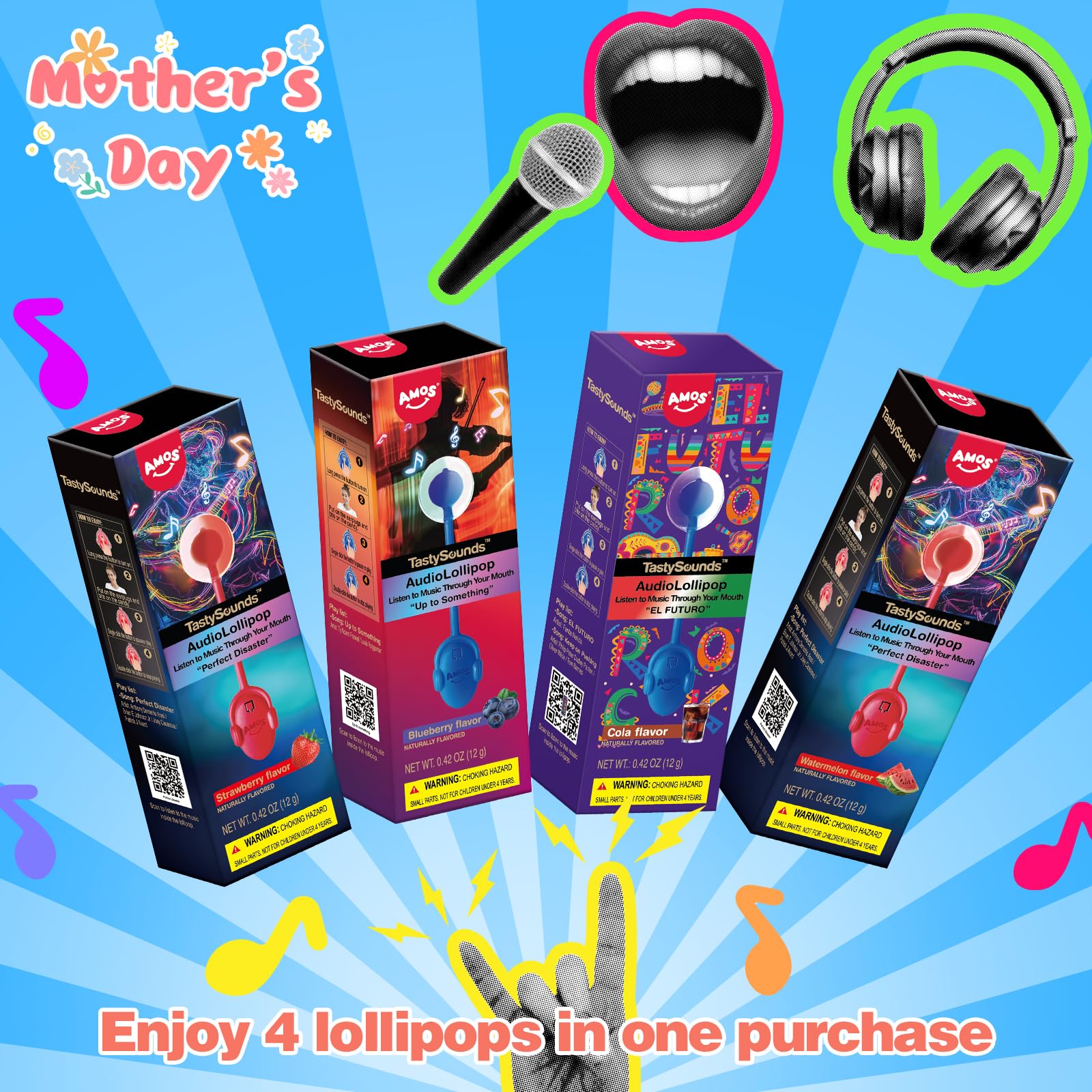 Q: What are the flavors included in the Amos TastySounds Audio Lollipop pack?A: The Amos TastySounds Audio Lollipop pack includes four delicious flavors: Blueberry, Strawberry, Watermelon, and Cola.