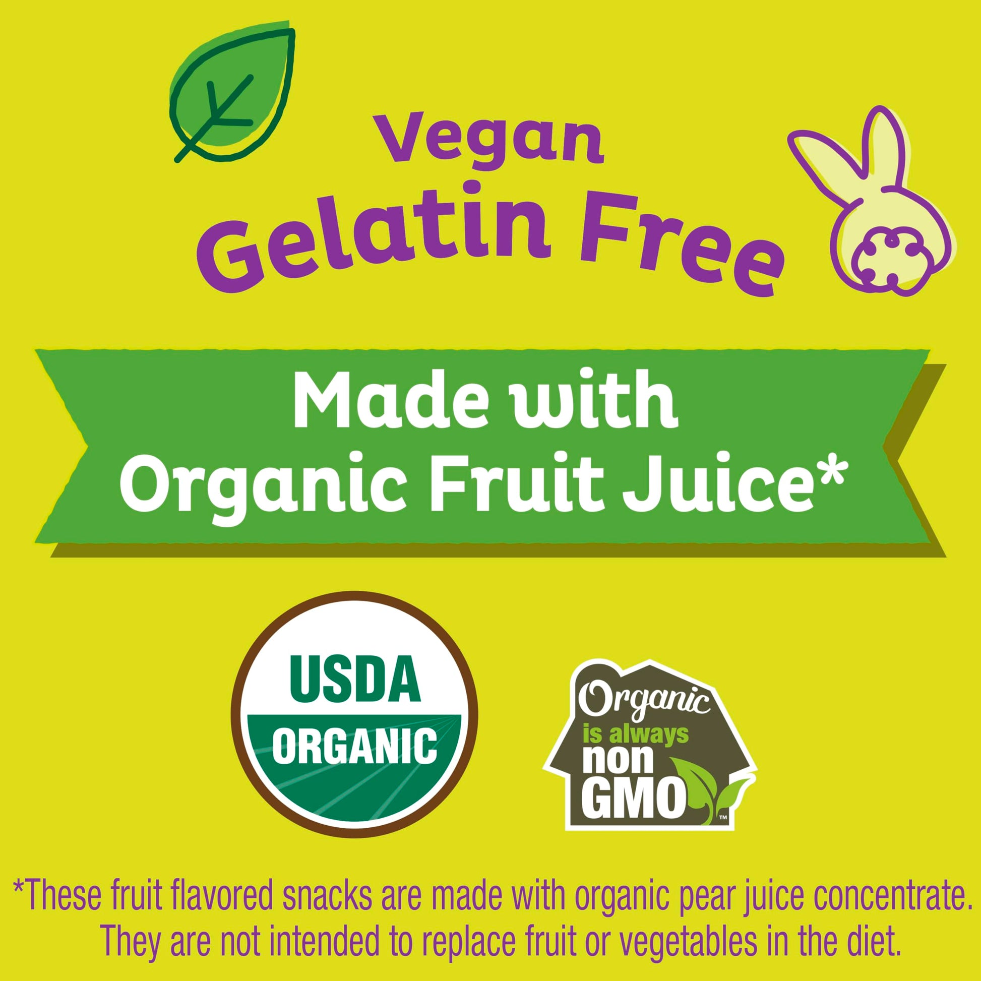 Q: What are Annie's Sour Bunnies Fruit Flavored Snacks made from?A: Annie's Sour Bunnies are made with organic pear juice concentrate and contain no artificial flavors or synthetic colors. They are vegan, gelatin-free, and gluten-free, providing a delicious snack without high-fructose corn syrup.