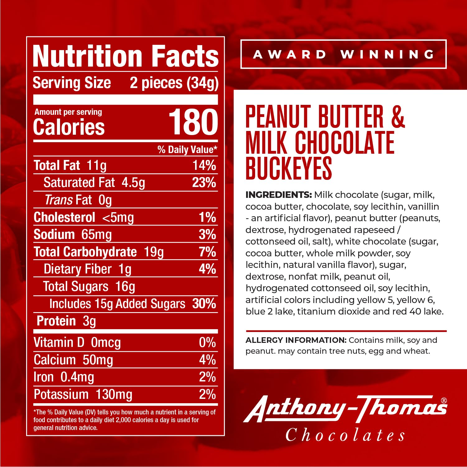 Anthony Thomas Buckeyes Candy Are Made With Premium Quality Ingredients To Maintain The Best Indulgent Flavor Why These Buckeyes Candy? Our Buckeyes Are Made With Premium Real Chocolate, Milk And Smooth, Creamy Peanut Butter. So Indulge In The Deliciousness Of These Creamy, Smooth Chocolate Peanut Butter Buckeyes That Melt In Your Mouth. Anthony Thomas Buckeyes Are Made With The Same Recipe Since Our Creation In 1952. We Have Maintained The Same Outstanding Quality Of Chocolates And Confections. Ready To Eat Anytime With No Fuss. You Can Use These Buckeye Candy From Ohio As A Snack Or Add Them As A Topping To Frozen Yogurt And Ice Cream. These Award Winning Buckeyes Chocolates Are Perfect For Sharing On Special Occasions Like Holidays, Parties, Weddings, Birthdays And More Pack Includes: 12 Delicious Buckeye Candy