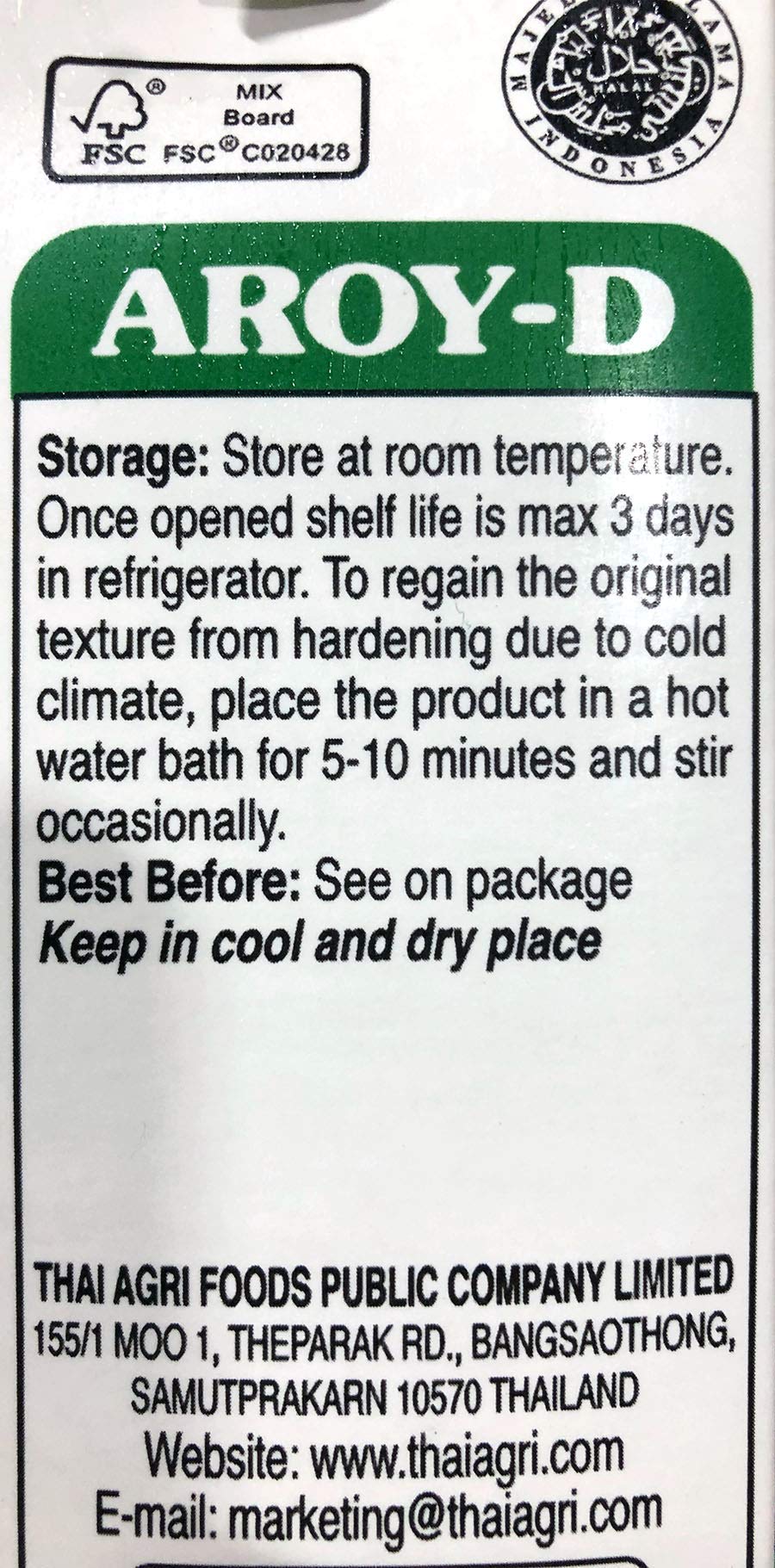 - Q: What should I do if Aroy-D Coconut Milk solidifies? A: If the coconut milk becomes solidified due to cold temperatures, simply place the carton in a hot water bath for 5-10 minutes, stirring occasionally to restore its original texture.