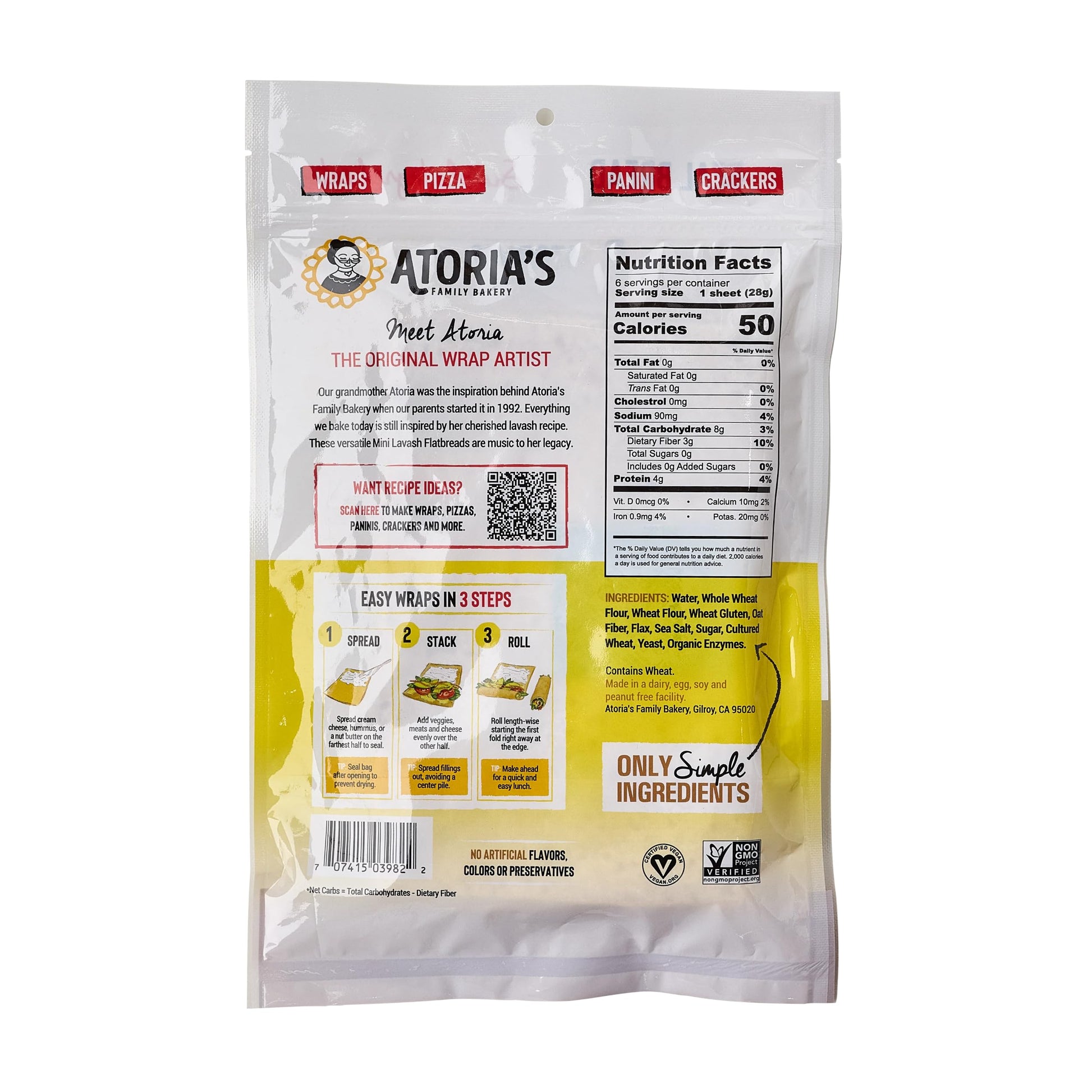 Q: What are the main ingredients in Atoria's Family Bakery Mini Whole Grain & Flax Lavash?A: Atoria's Lavash is made from whole grain flour and flaxseed, enriched to provide nutritional benefits while maintaining a soft and chewy texture. This product is also Non-GMO and vegan.