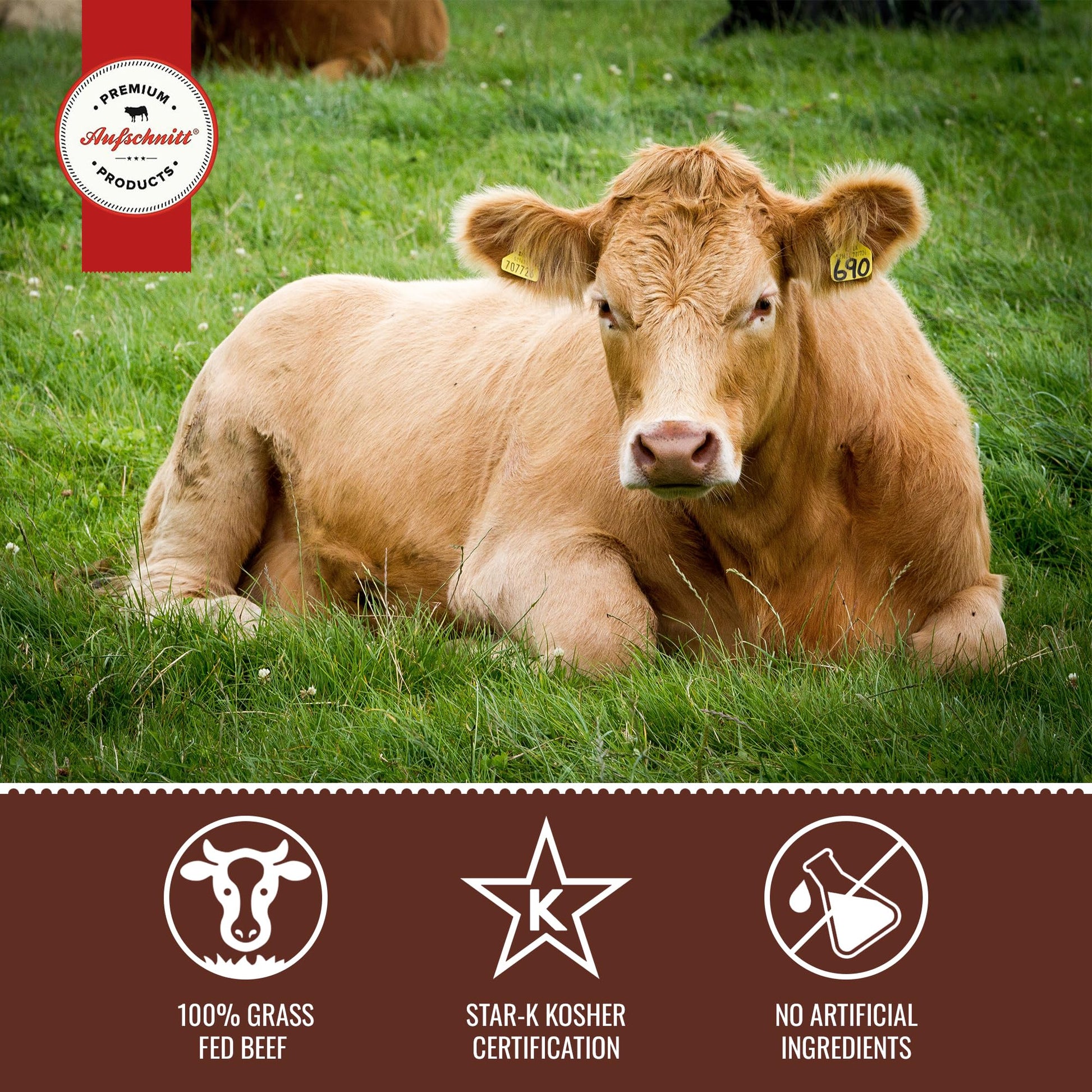 • Q: What type of beef is used in Aufschnitt Beef Jerky? A: Aufschnitt Beef Jerky is made from 100% USDA certified grass-fed beef, ensuring high quality and a natural taste.