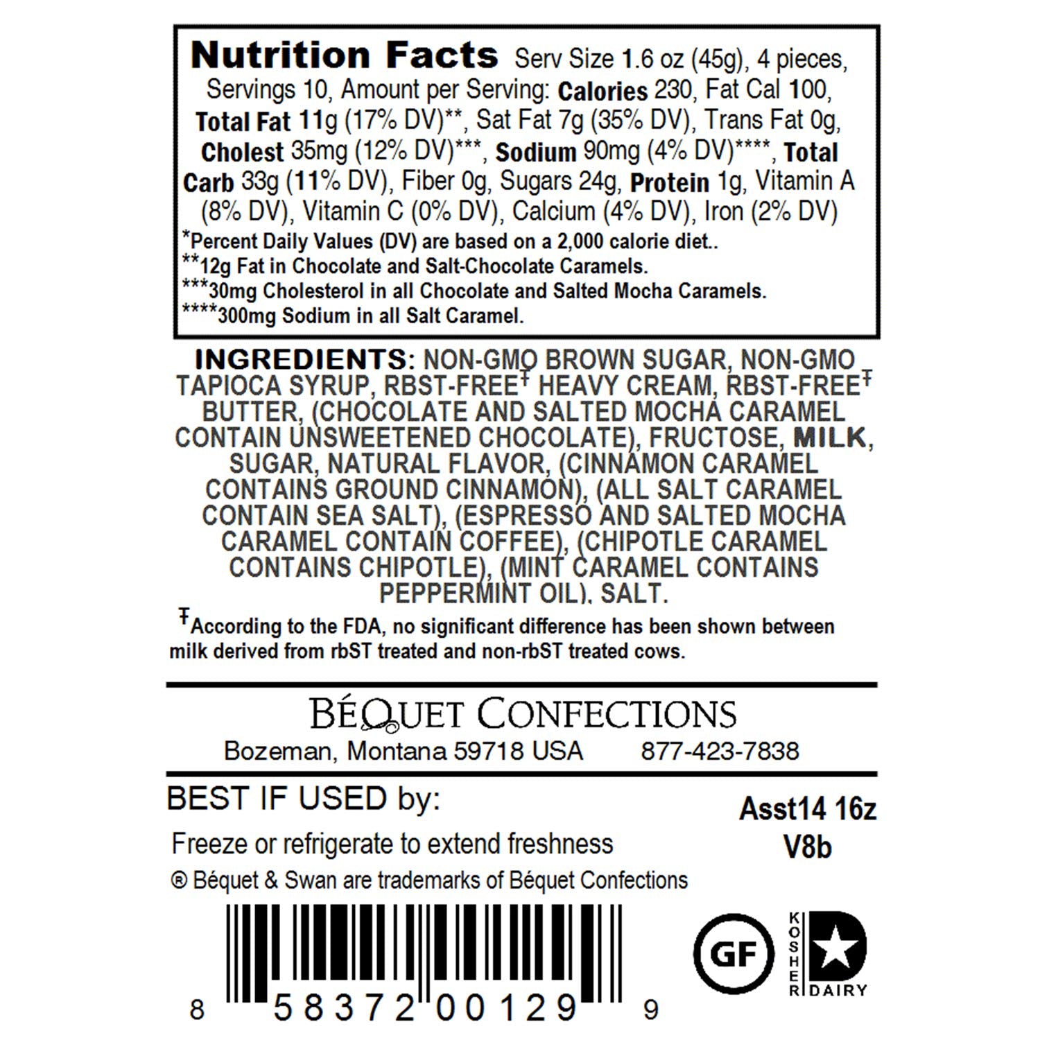 Q: What flavors are included in the Béquet Caramel Assorted Mix?A: The Béquet Caramel Assorted Mix features a delightful variety of flavors including Celtic Sea Salt, Salt Chocolate, Classic Vanilla, Butterscotch, Green Apple, Salted Mocha, and Salted Butterscotch.