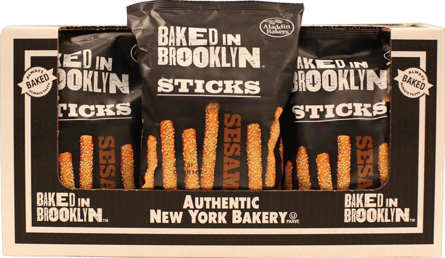 Aladdin Bakers. 0 G Trans Fat. No Cholesterol. No Nonsense. Per 3 Sticks: 70 Calories; 0 G Sat Fat (0% Dv); 115 Mg Sodium (5% Dv); 0 G Sugars. Always Baked. No High Fructose Corn Syrup. These Delicious Breadsticks Are Baked In Brooklyn, Where The Water Is Special And The Customers Know Quality Bread. The Crunch And Flavor Are Unmistakably Perfect. No Trans Fats, No Cholesterol, No-Nonsense. Our Sesame Seed Sticks Are Sprinkled With Sesame Seeds And Flash-Baked At 450 Degrees F For Maximum Crunch. Try Them Straight Up As A Wholesome Snack. Or Match Them With Creamy Dips, Savory Spreads Or A Good Schmear.