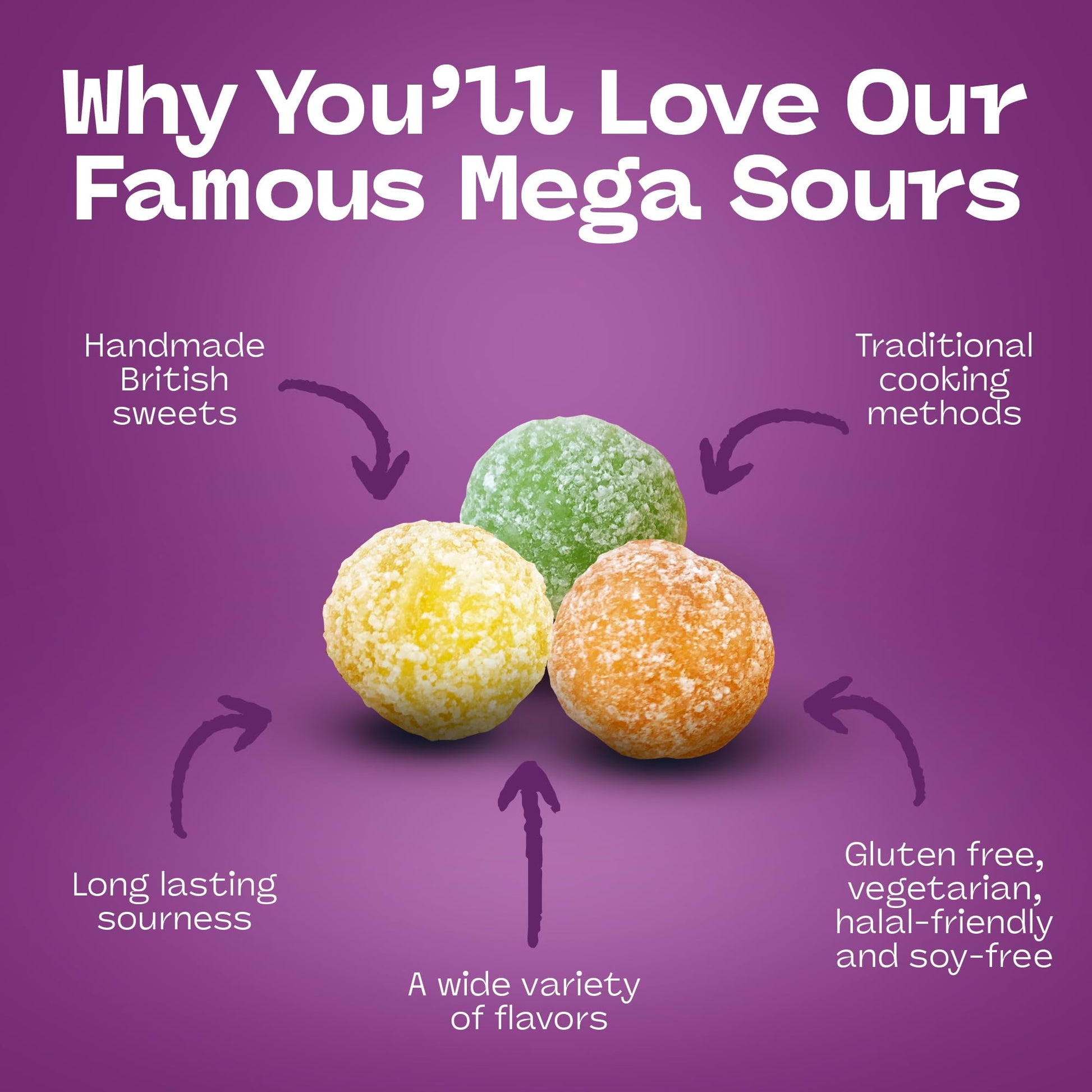 - Q: What makes Barnetts Mega Sour Fruits different from other sour candies? A: Barnetts Mega Sour Fruits stand out due to their unique handmade process using traditional copper pan methods, which enhances the depth of flavor. Each candy features an intense sour coating that lasts for about 20 seconds, followed by a juicy fruit center, offering a distinct flavor experience that sets them apart from other sour candies.