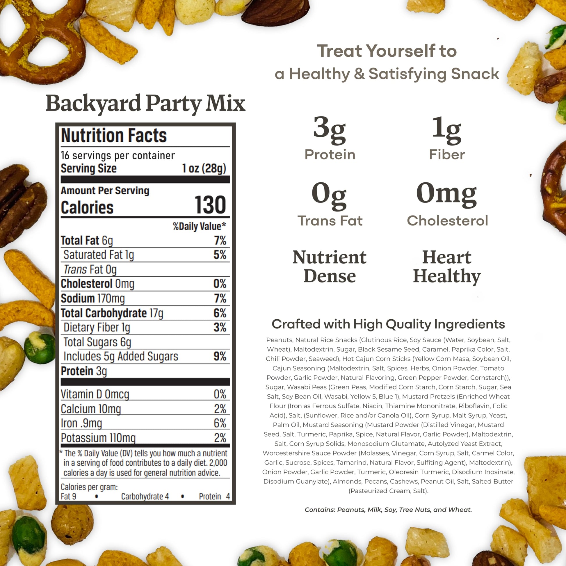 Q: What are the key ingredients in Belmont Peanuts Backyard Party Mix?A: Belmont Peanuts Backyard Party Mix includes a delicious blend of Butter Toffee peanuts, wasabi peas, cashews, corn sticks, rice sticks, pecans, and pretzels, all crafted with simple, natural ingredients.