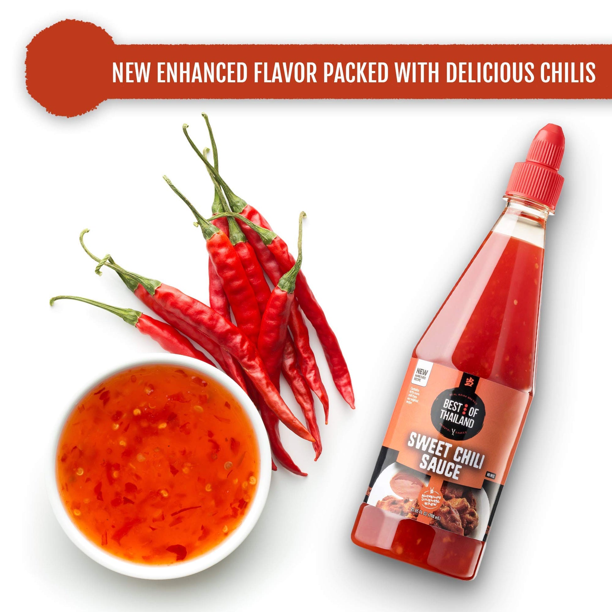 Q: What are the main ingredients in the Best of Thailand Sweet Chili Sauce?A: The Best of Thailand Sweet Chili Sauce is made from 100% natural red chili peppers, garlic, salt, sugar, and vinegar, ensuring a real authentic Asian-brewed flavor.