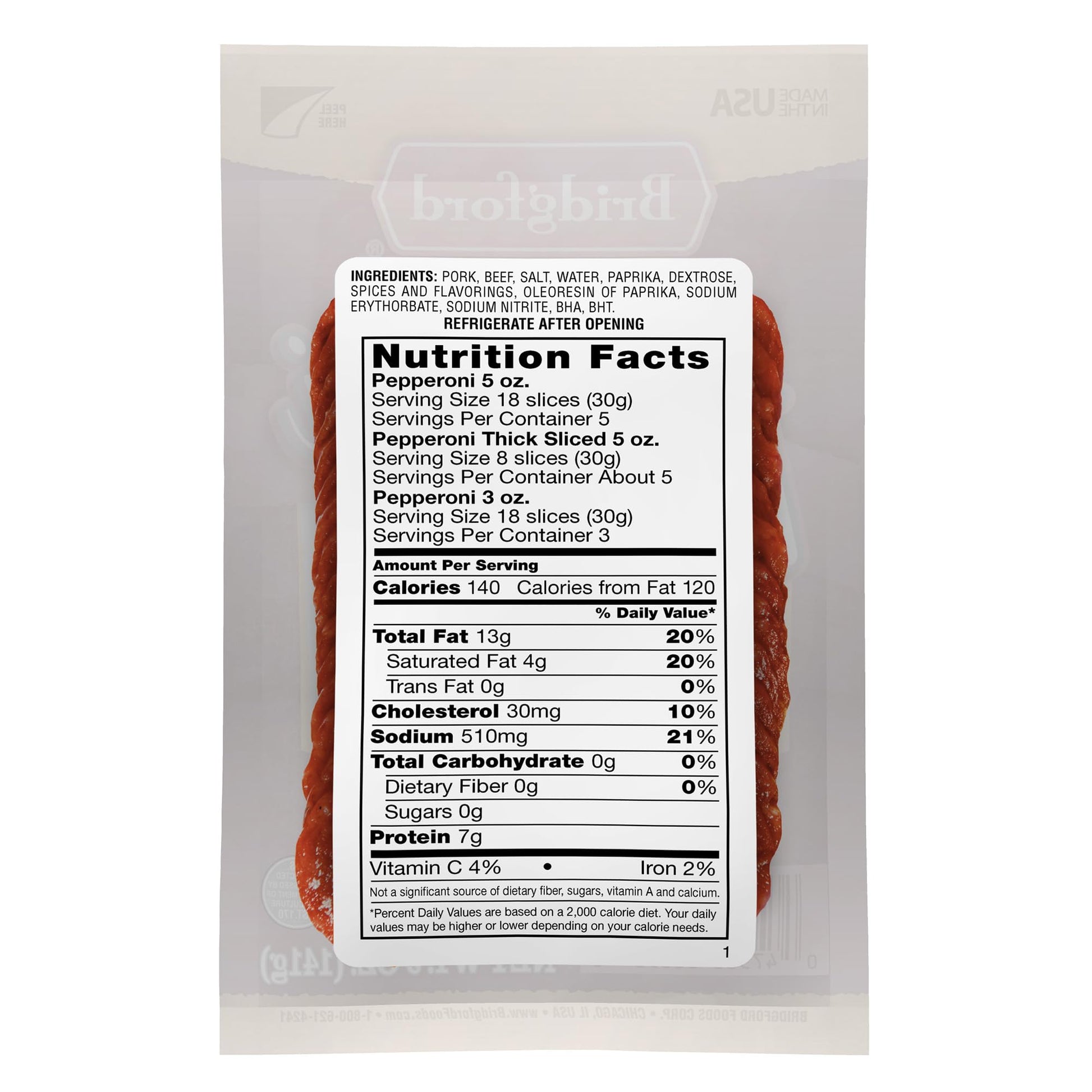 - Q: What are the ingredients in Bridgford Thick Sliced Pepperoni? A: Bridgford Thick Sliced Pepperoni is made from premium quality ingredients, ensuring a flavorful experience with every bite. It undergoes a natural fermentation and aging process, combined with traditional spices to deliver an authentic pepperoni taste.