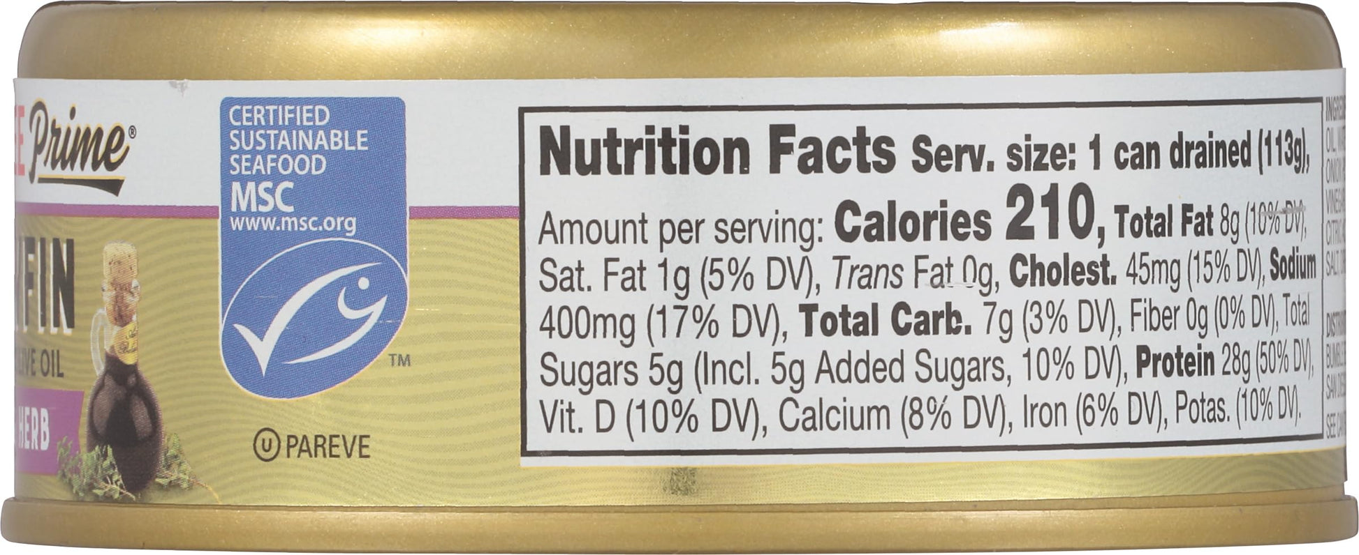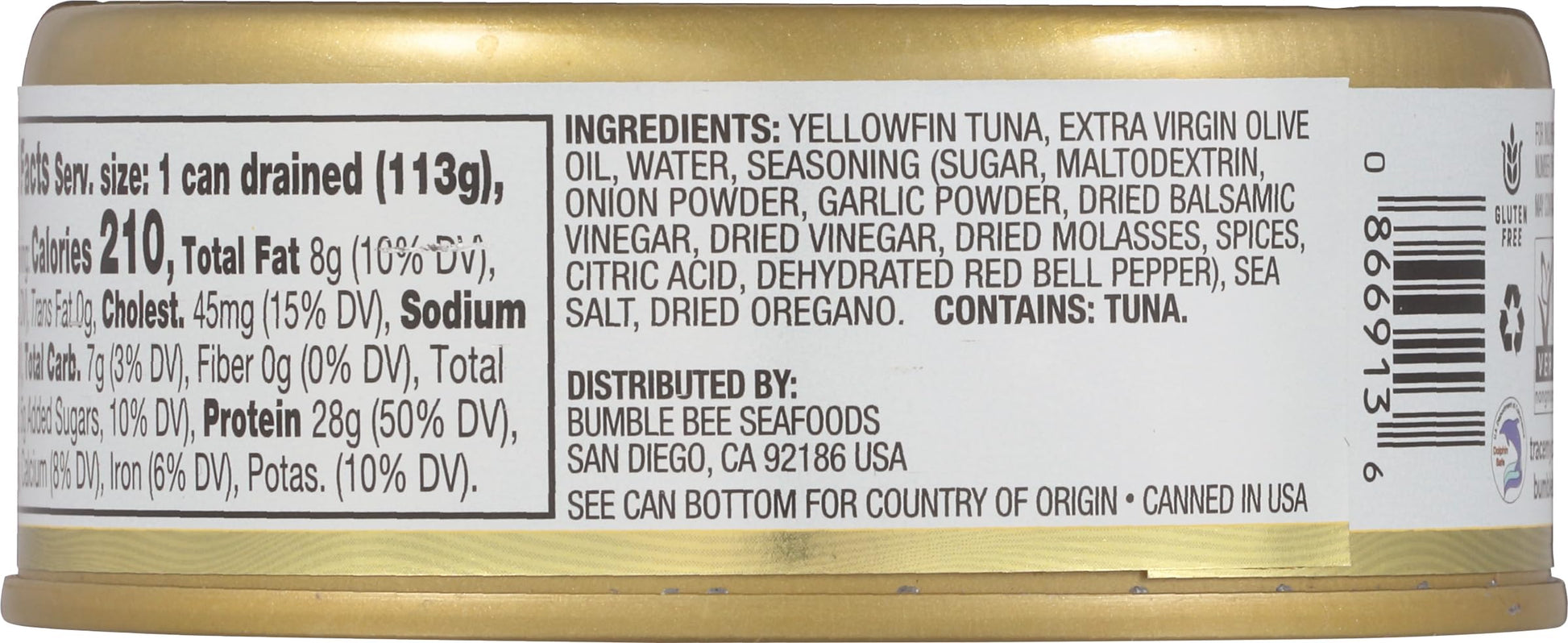 Q: What are the main ingredients in Bumble Bee Prime Balsamic & Herb Yellowfin Tuna?A: The main ingredients include wild caught yellowfin tuna, extra virgin olive oil, balsamic vinegar, savory herbs, and a blend of spices to enhance flavor.