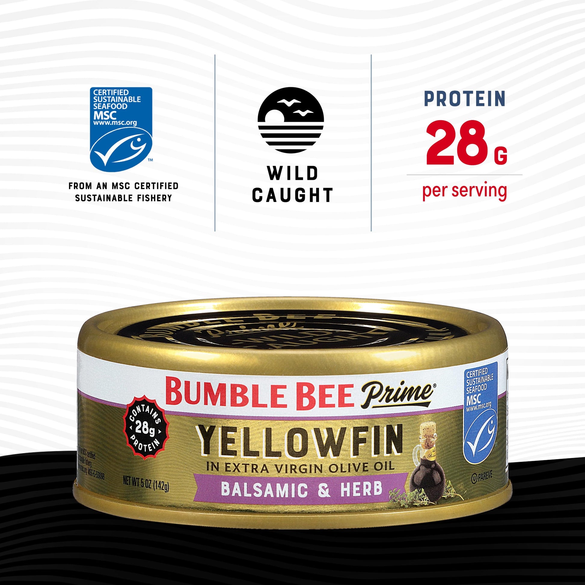 Q: How much protein does this tuna provide per serving?A: Each 5 oz can of Bumble Bee Prime Balsamic & Herb Yellowfin Tuna contains 28g of protein, making it an excellent choice for a high-protein meal or snack.