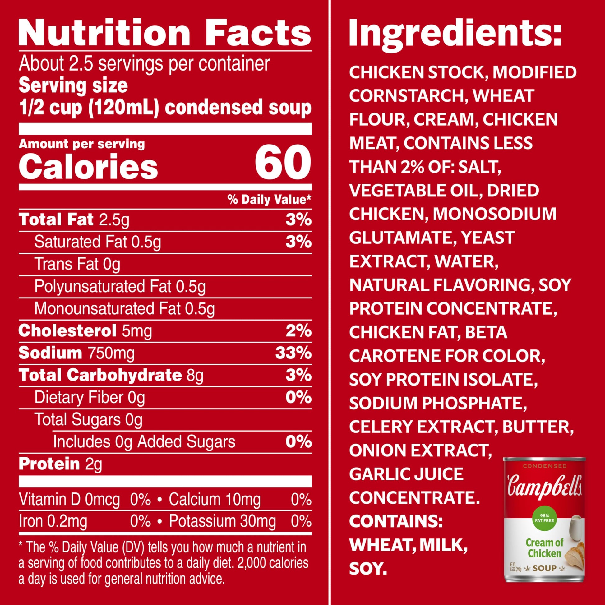 - Q: Is Campbell’s Cream of Chicken Soup suitable for people with dietary restrictions? A: Campbell’s 98% Fat Free Cream of Chicken Soup does not contain added sugars and uses high-quality ingredients. However, those with specific dietary restrictions or allergies should check the nutrition panel for complete ingredient information.