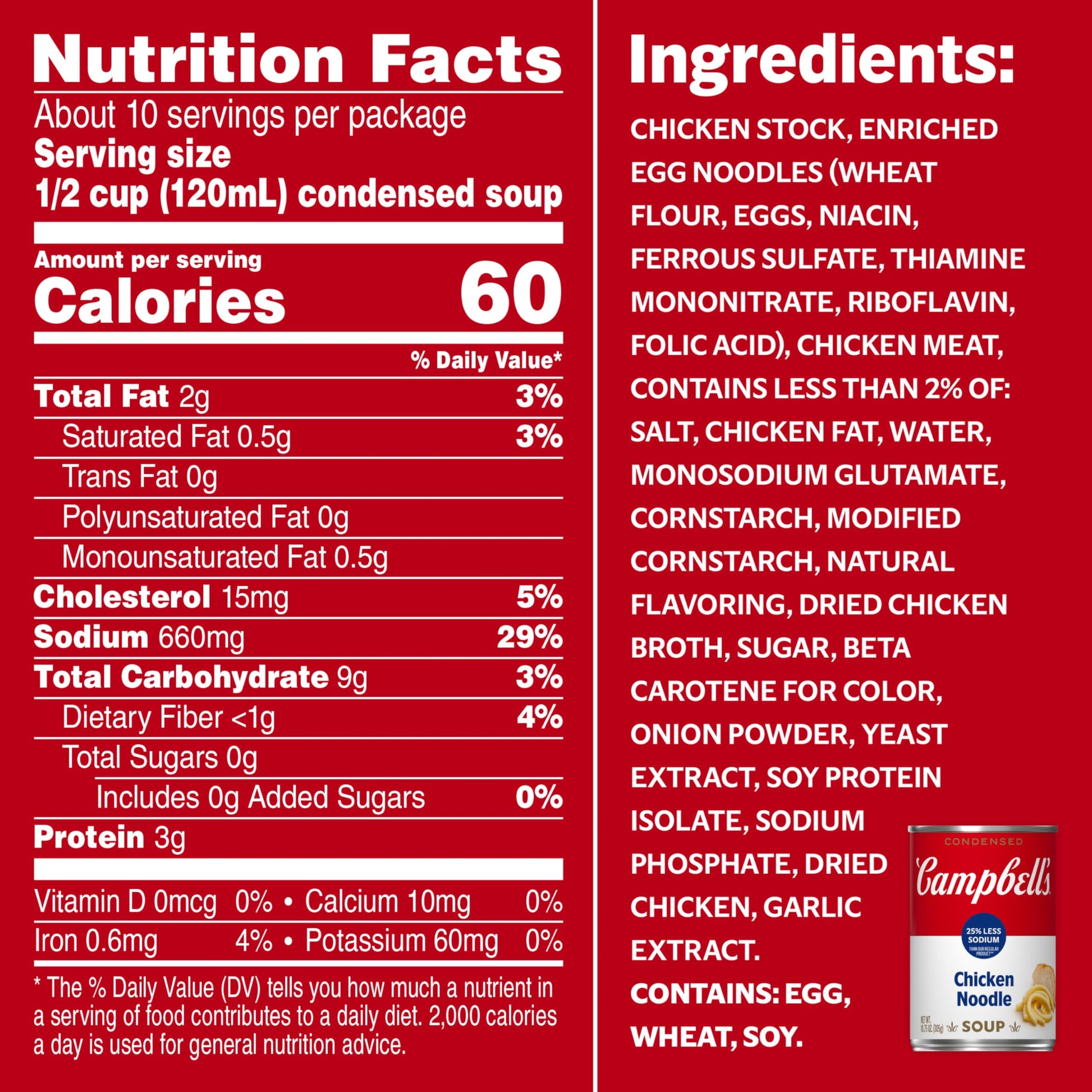Cozy Up With A Steamy Bowl Of Campbells Condensed 25% Less Sodium* Chicken Noodle Soup. With 25% Less Sodium Than Our Regular Chicken Noodle Soup,* This Delicious Chicken Soup Is Crafted With Perfectly Seasoned Golden Chicken Broth, Fresh Egg Noodles, And Tender Chicken Meat With No Antibiotics. The Result Is A Soul-Warming Chicken Noodle Soup That Brings A Smile With Every Spoonful. Customize It With Your Favorite Toppings, Season It With Fresh Herbs, Or Pair It With Apple Slices. This Convenient Canned Soup Is A Year-Round Pantry Staple And The Perfect Comfort Food On A Chilly Day Or When Youre Feeling Under The Weather. Simply Mix The Condensed Soup With 1 Can Of Water And Microwave On High For 2.5 To 3 Minutes In A Covered Microwave-Safe Bowl, Or Heat In A Pot On The Stove, Stirring Occasionally. Each 10.75 Oz Recyclable Can Contains About 2.5 Servings Of Microwave Soup. From Chicken Noodle To Cream Of Mushroom And Everything In Between, Campbells Makes Delicious Soups In Flavors Your Family Knows And Loves, With Quality, Farm-Grown Ingredients In Every Can. Mm! Mm! Good! (*Contains 660Mg Sodium Per Serving Vs. 890Mg In Our Regular Chicken Noodle Soup)