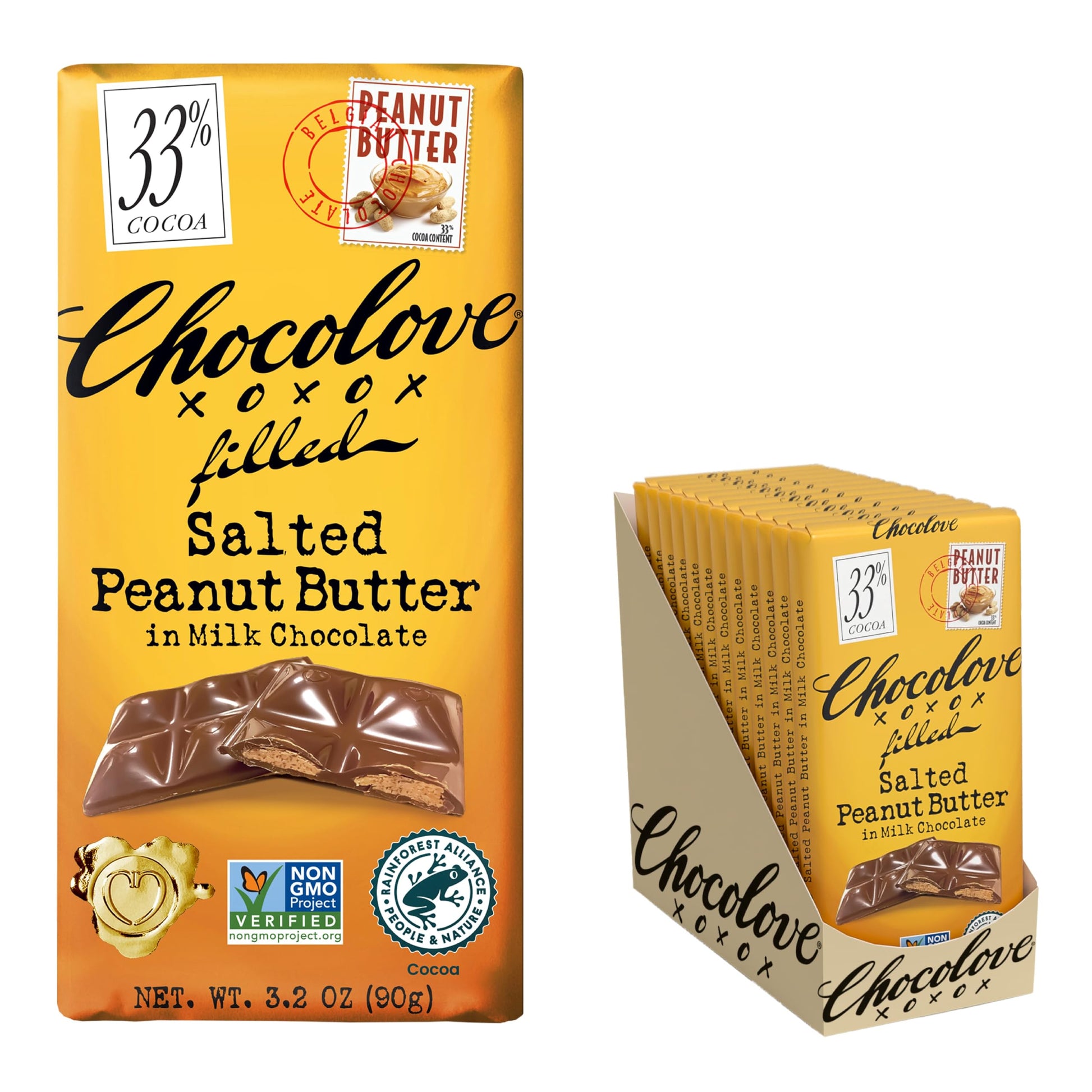 - Q: Are Chocolove Filled Salted Peanut Butter Milk Chocolate Bars suitable for people with dietary restrictions? A: Chocolove Filled Salted Peanut Butter Milk Chocolate Bars are Non-GMO and Rainforest Alliance Certified. However, it’s important to check the packaging for allergen information as they may contain nuts or other allergens.