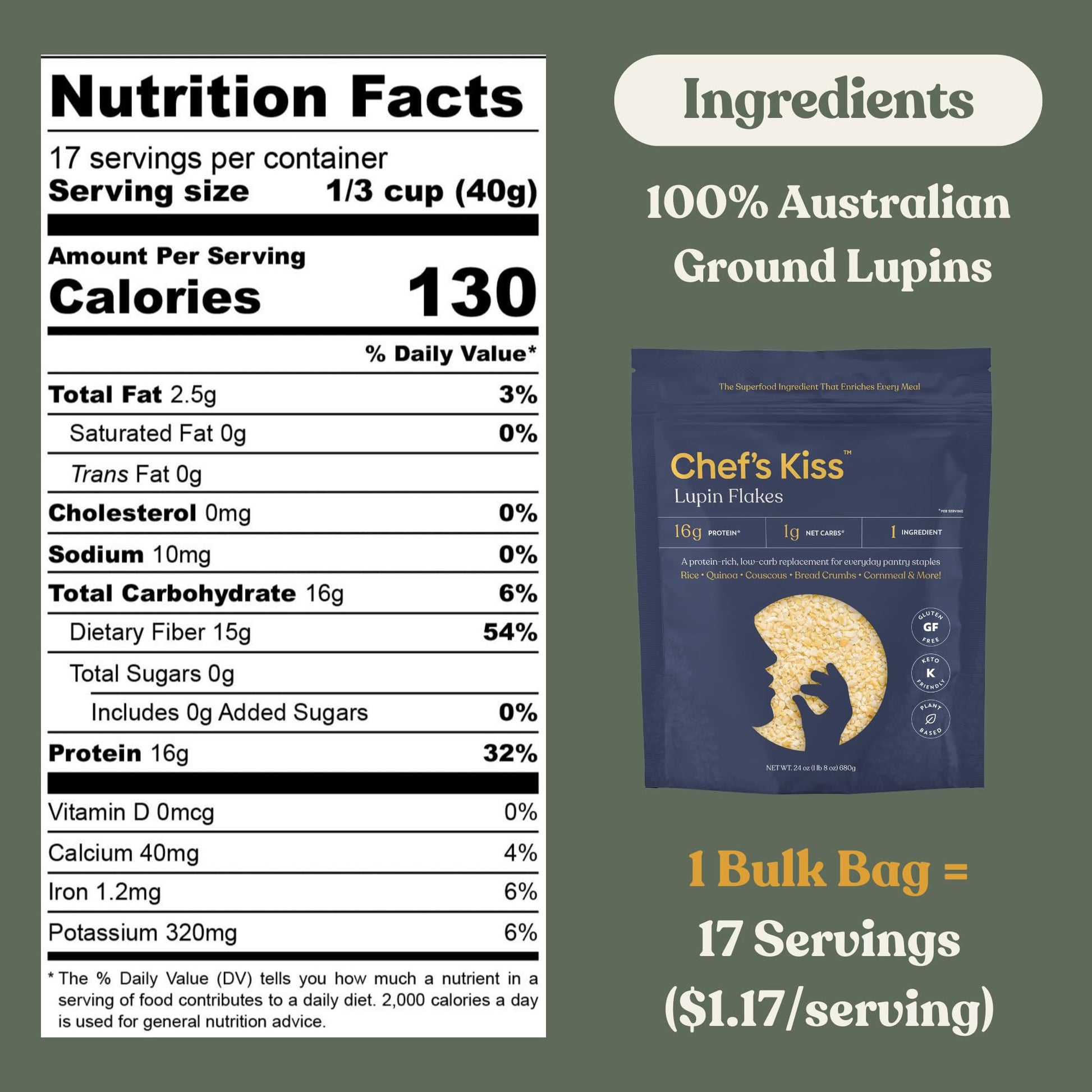 Meet Your New Favorite Pantry Staple-Chefs Kiss Lupin Flakes. This Ultra-Versatile, Nutrient-Dense Superfood Transforms Everyday Meals With The Power Of 16G Of Whole Food Plant Protein, Just 1G Of Net Carbs, And A Whopping 15G Of Prebiotic Fiber Per Serving. Lupin Flakes Are A Game-Changing Ingredient For Anyone Looking To Eat Clean, Cut Carbs, Improve Their Gut Health Or Boost Their Protein Intake. Made From Just One Ingredient-100% Australian Sweet Ground Lupins-Lupin Flakes Are A Low-Carb, High-Protein Swap For Rice, Quinoa, Couscous, Breadcrumbs, And Flour. They Cook In Just 2-3 Minutes Using The Microwave, Stovetop, Oven, Or Frying Pan. Whether Youre Making Keto Rice Bowls, Gluten-Free Chicken Tenders, Protein-Packed Pancakes, Or Crunchy Salad Toppers, This Clean, Nutrient-Rich Ingredient Has You Covered. Each Bag Contains 17 Servings, With Every Serving Delivering: 16G Of Whole Food Protein With All 9 Essential Amino Acids 15G Of Gut-Nourishing Fiber 1G Net Carbs For Keto Diets And Low-Glycemic Support Vitamins B & E + Minerals Like Iron, Potassium, And Magnesium Powerful Antioxidants Including Flavonoids And Carotenoids Ways To Use Lupin Flakes: Swap For Rice Or Quinoa In Stir-Fries And Bowls Add Crunch And Protein To Salads And Nutrients To Soups Blend Into Dips, Sauces, And Dressings Coat Meat And Veggies As A Breadcrumb Alternative Bake Into Muffins, Cookies, And High-Protein Breads Replace Oats In Porridge Or Griddle Into Pancakes What Makes It All Possible Lupins-An Ancient Superfood Legume That Once Fueled Some Of Historys Most Prolific Civilizations, Including The Egyptian, Roman, And Incan Empires. Now It Powers Your Plate. With An Unmatched Nutritional Profile, Lupins Deliver More Protein Than Any Traditional Plant, More Fiber Than Any Legume, And Virtually No Digestible Carbs. This Isnt Just Another Superfood-Its A Foundational Ingredient For Better Modern Wellness, One Chefs Kiss Meal At A Time.