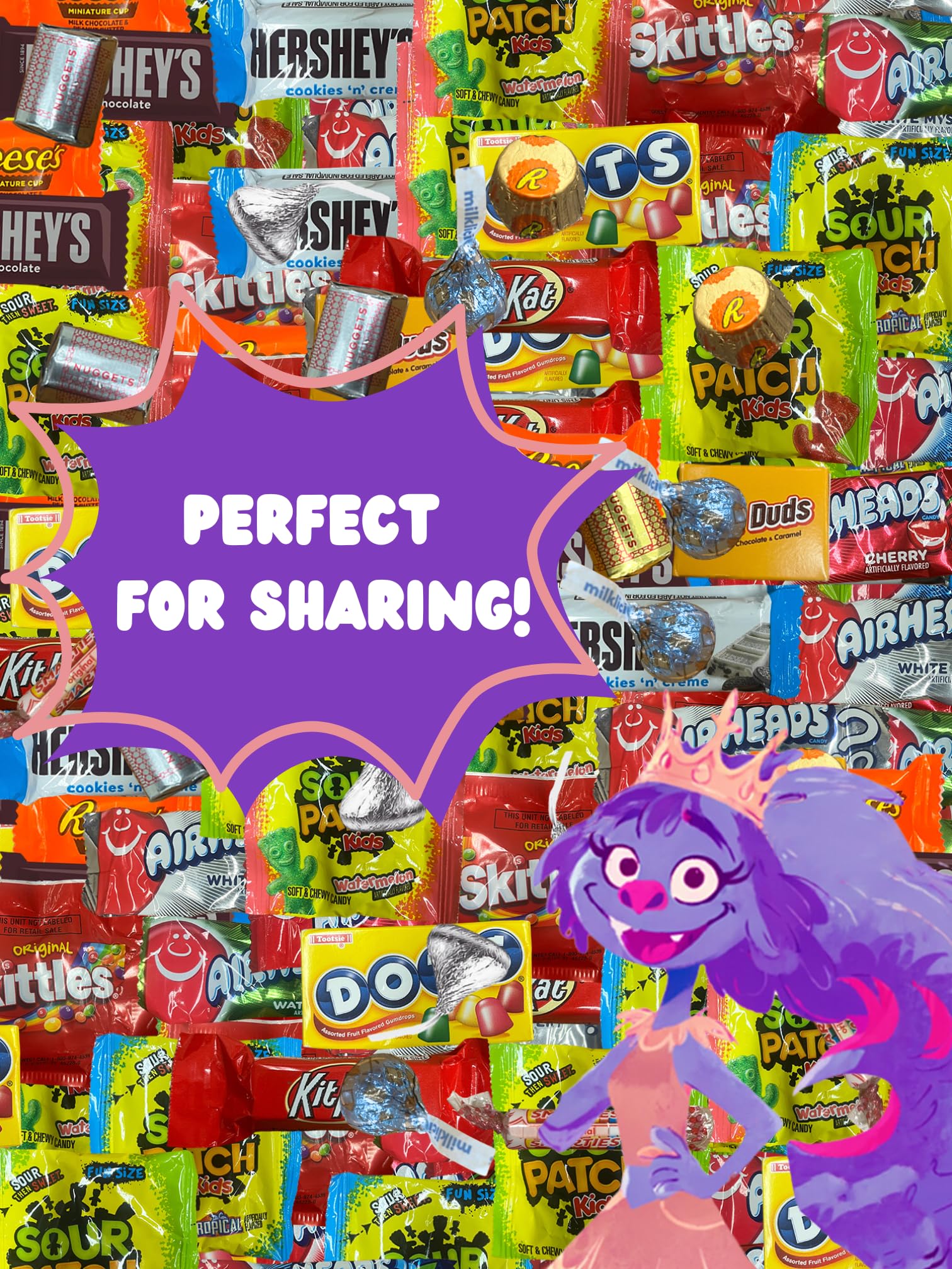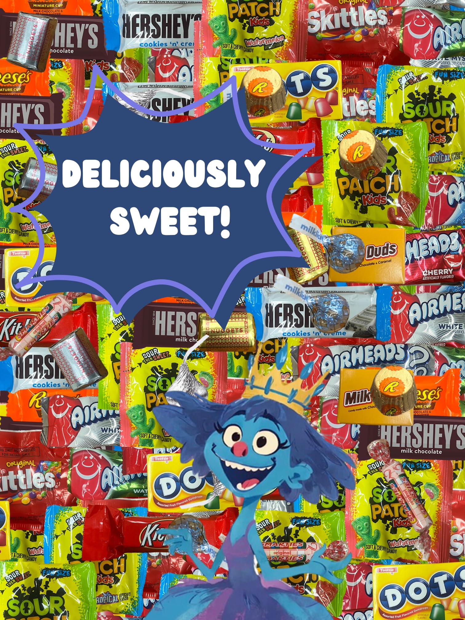 Q: What types of candies are included in the Chocolate and Candy Variety Pack?A: The Chocolate and Candy Variety Pack includes an assortment of individually wrapped treats such as Sour Patch, Haribo, Jolly Rancher, and various chocolate bars, making it a perfect mix for candy lovers.