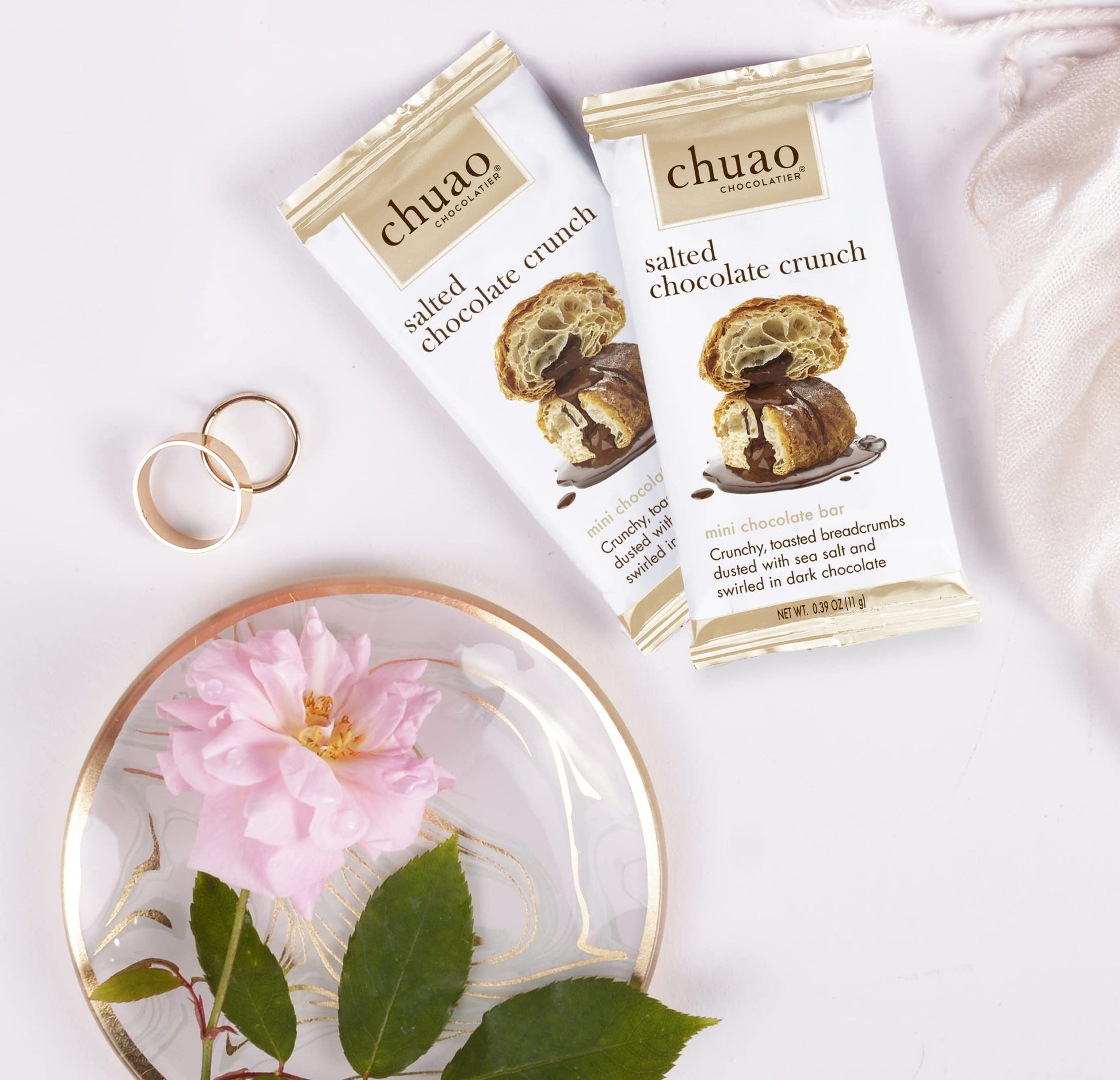 Q: What are the main ingredients in Chuao Chocolatier Salted Chocolate Crunch Dark Chocolate Mini Bars?A: Chuao Chocolatier Salted Chocolate Crunch Dark Chocolate Mini Bars are made with high-quality dark chocolate, sea salt, and no artificial preservatives, additives, or flavorings, ensuring a pure and delicious taste.