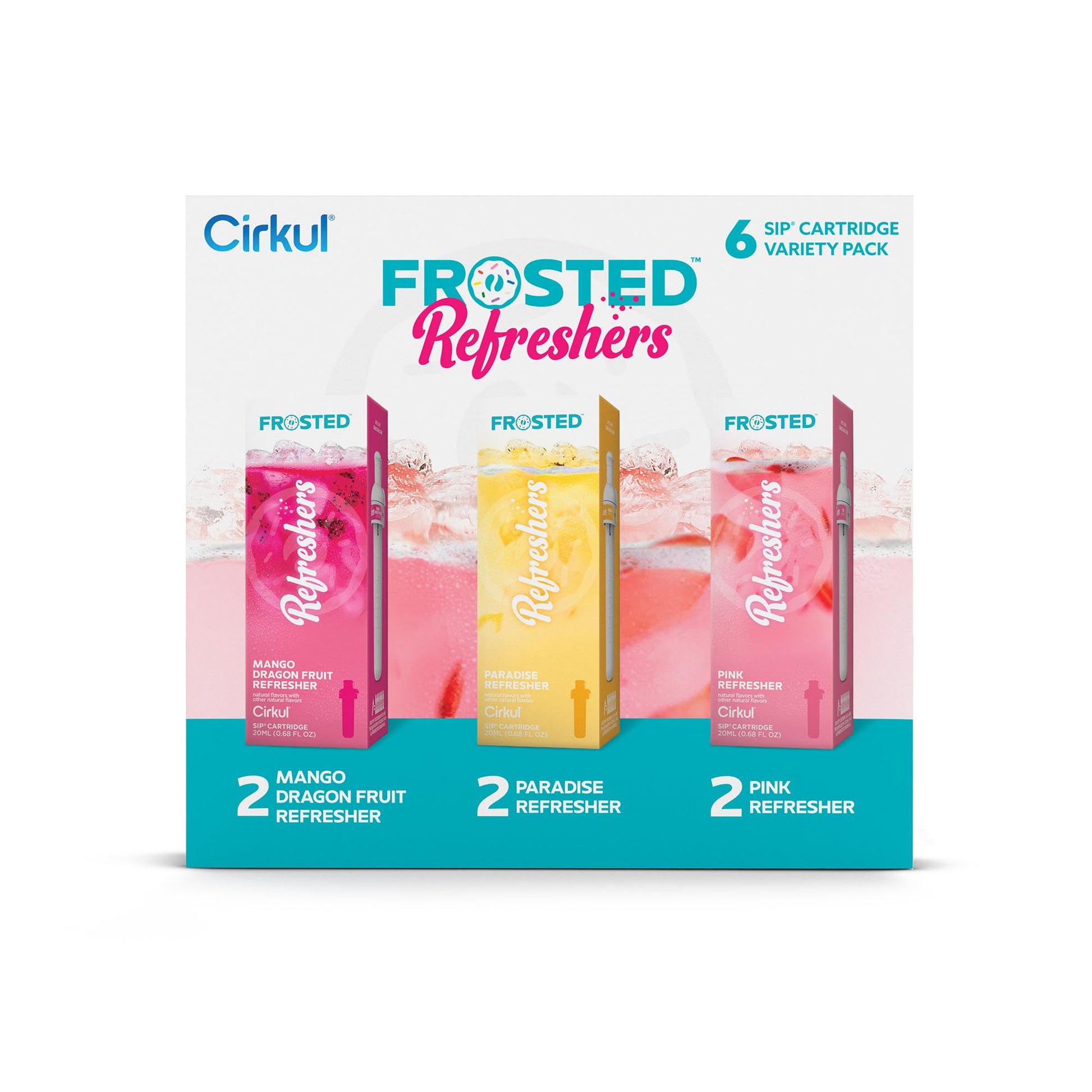Q: What flavors are included in the Cirkul Frosted Refreshers Variety Pack?A: The Cirkul Frosted Refreshers Variety Pack includes two Pink, two Mango Dragon Fruit, and two Paradise flavor cartridges, providing a delightful mix of fruity tastes to enhance your water.