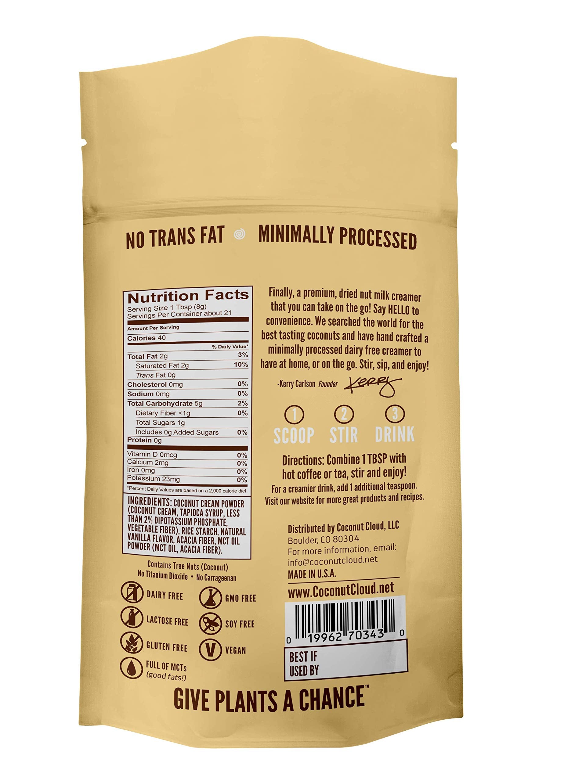 Q: What are the key ingredients in Coconut Cloud coffee creamer?A: Coconut Cloud coffee creamer is made from high-quality coconut milk powder and contains energizing MCT oil, ensuring a simple and healthy ingredient profile.