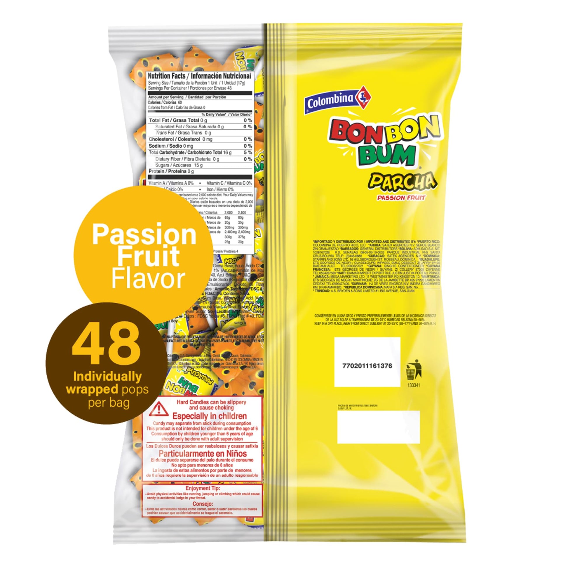 Q: What flavors do Colombina Bon Bon Bum Lollipops come in?A: Colombina Bon Bon Bum Lollipops are available in a delightful tropical passion fruit flavor, offering a unique and exotic taste that transports you to a paradise of fruity goodness.