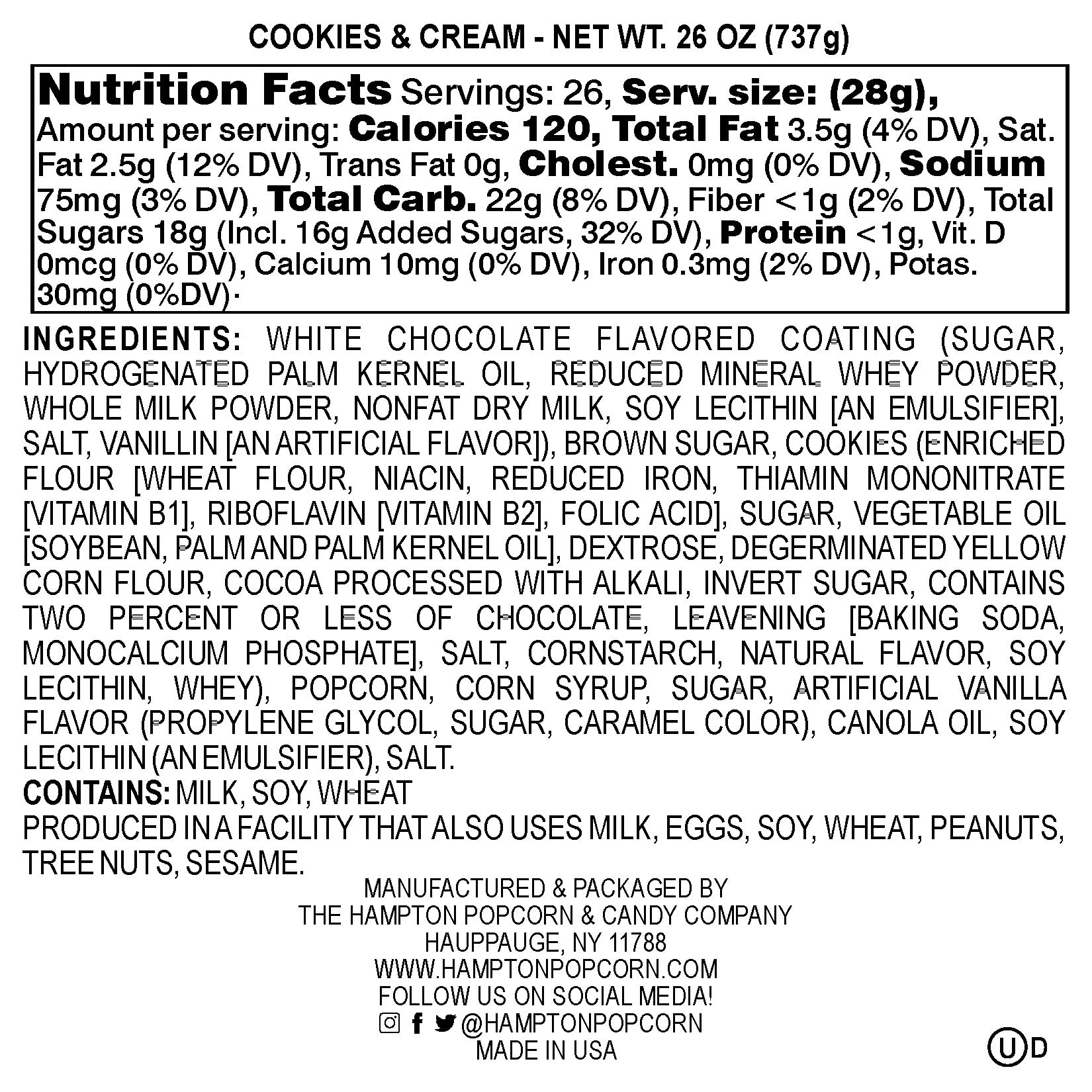 Q: Are there any allergens in the Cookies & Cream Popcorn?A: Yes, the Cookies & Cream Popcorn contains allergens including milk, soy, and wheat. It is produced in a facility that also processes eggs, peanuts, and tree nuts, so those with allergies should exercise caution.